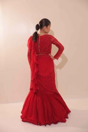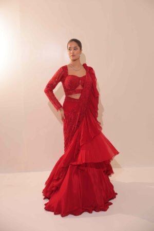 Drenched in a vibrant red hue, this pre-draped saree features cascading ruffles that add volume and movement, paired with a heavily embellished long-sleeve blouse.