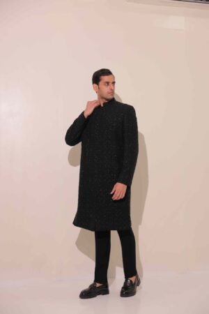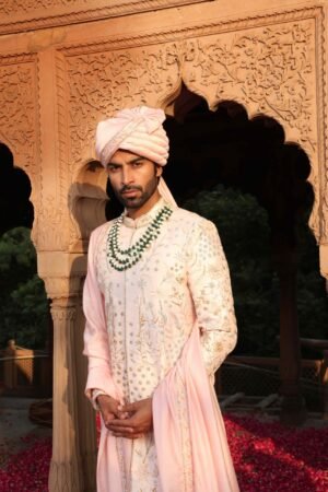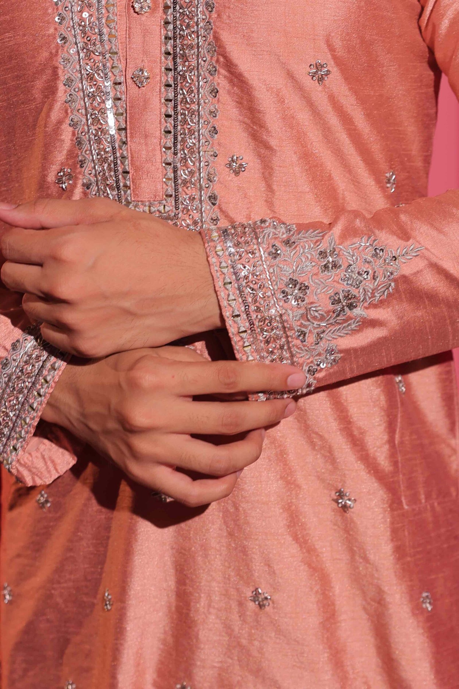 Crafted in a luxurious blush peach hue, this ensemble features intricate silver thread and sequin embroidery along the neckline, cuffs, and front placket.