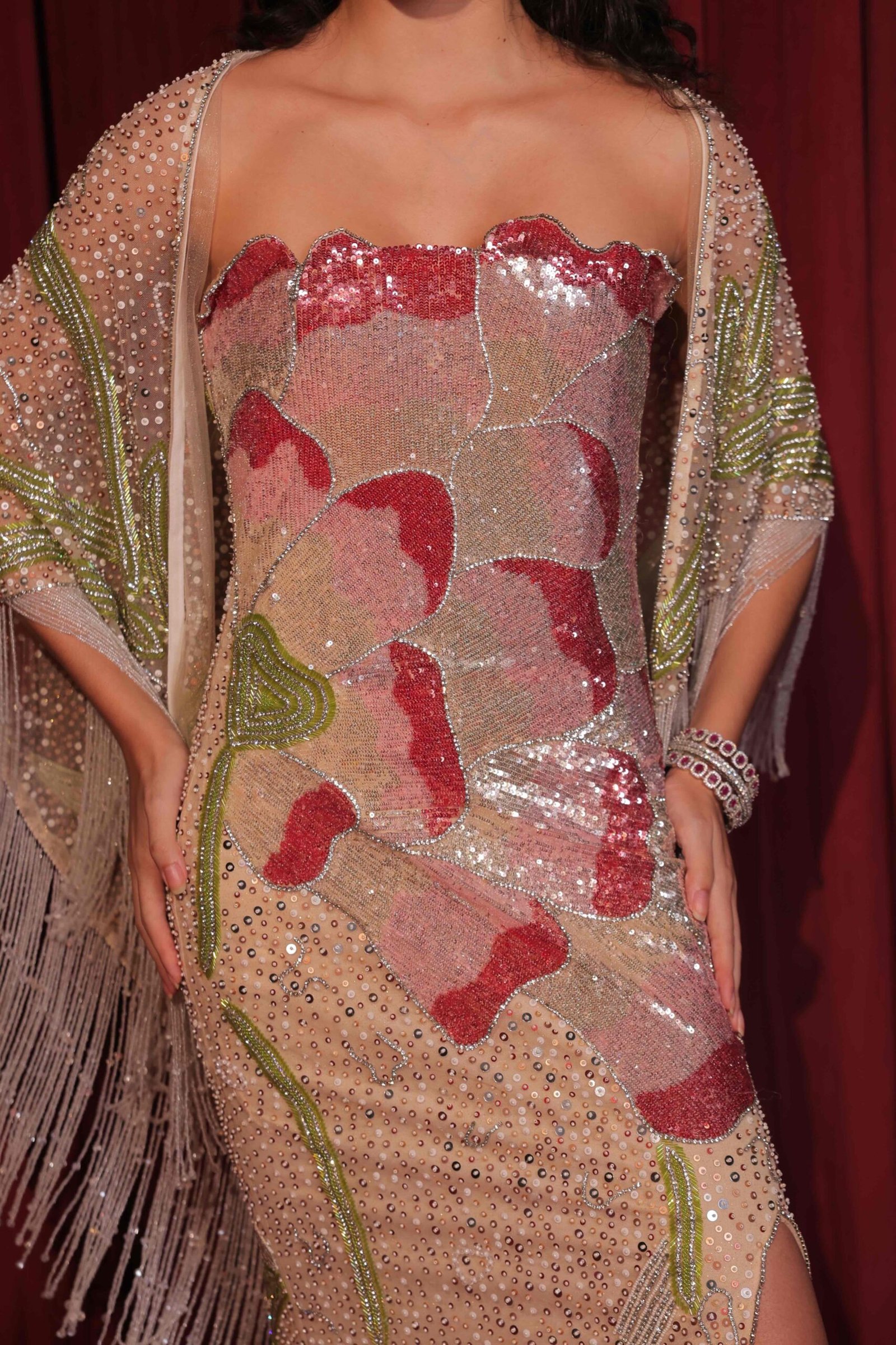 Accompanied by a delicately fringed embellished cape, this look exudes vintage glamour with a contemporary twist.