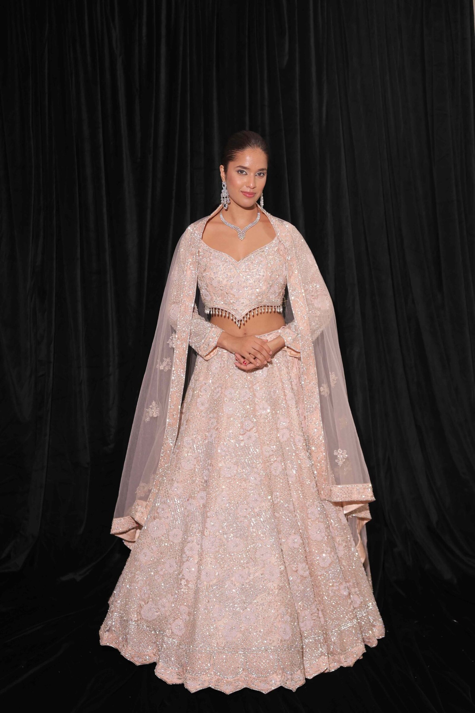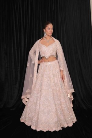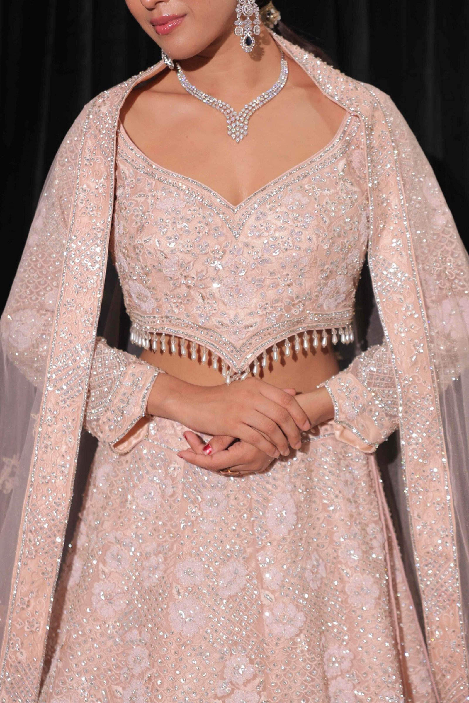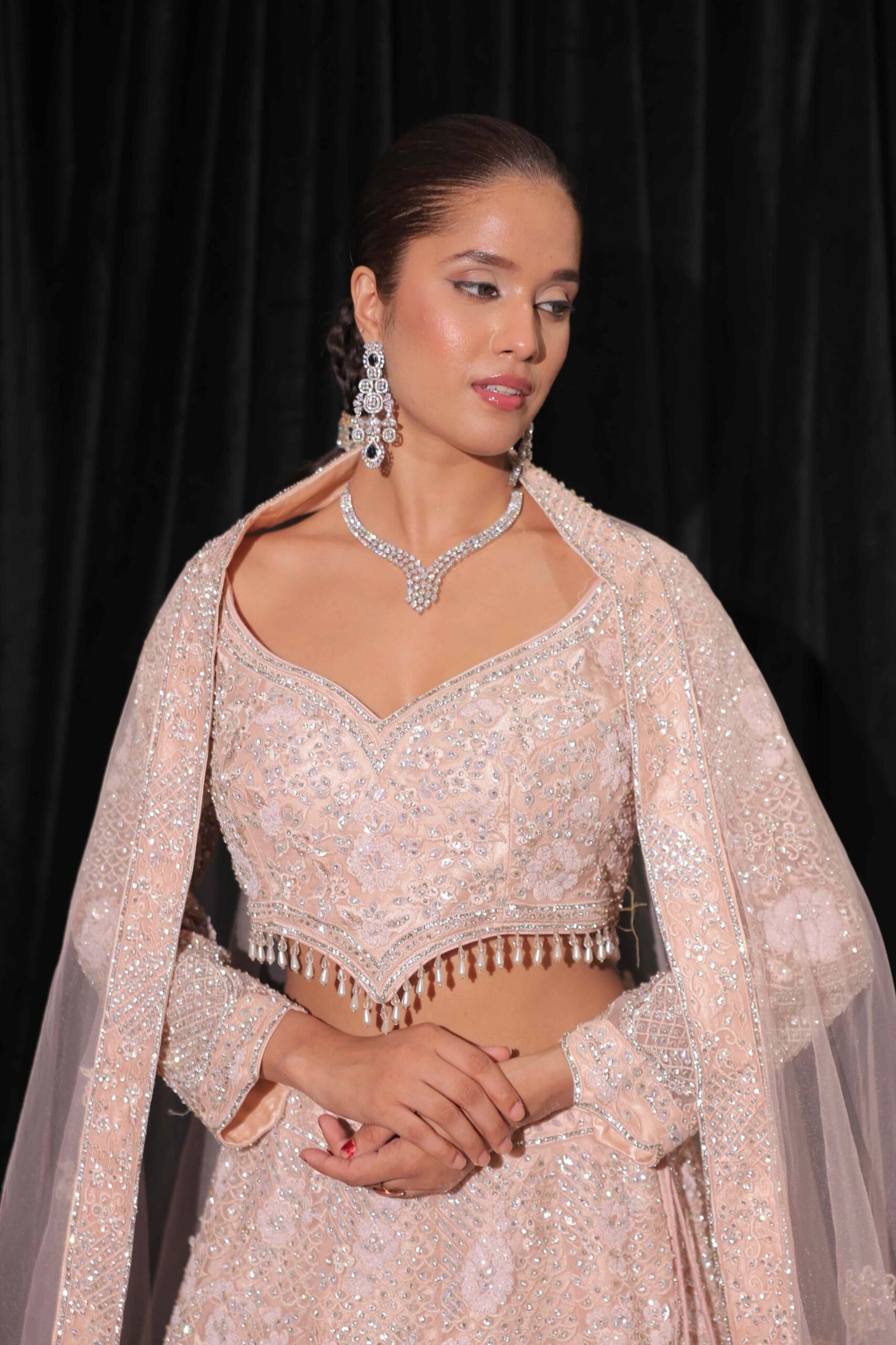 Radiate ethereal charm in our Blush Whisper Embellished Lehenga, a vision of grace and femininity.