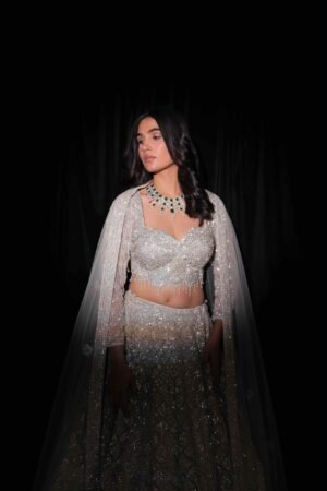 The Celestial Shimmer Lehenga exudes grandeur with its diamond ivory base and all-over sequin and crystal embroidery.