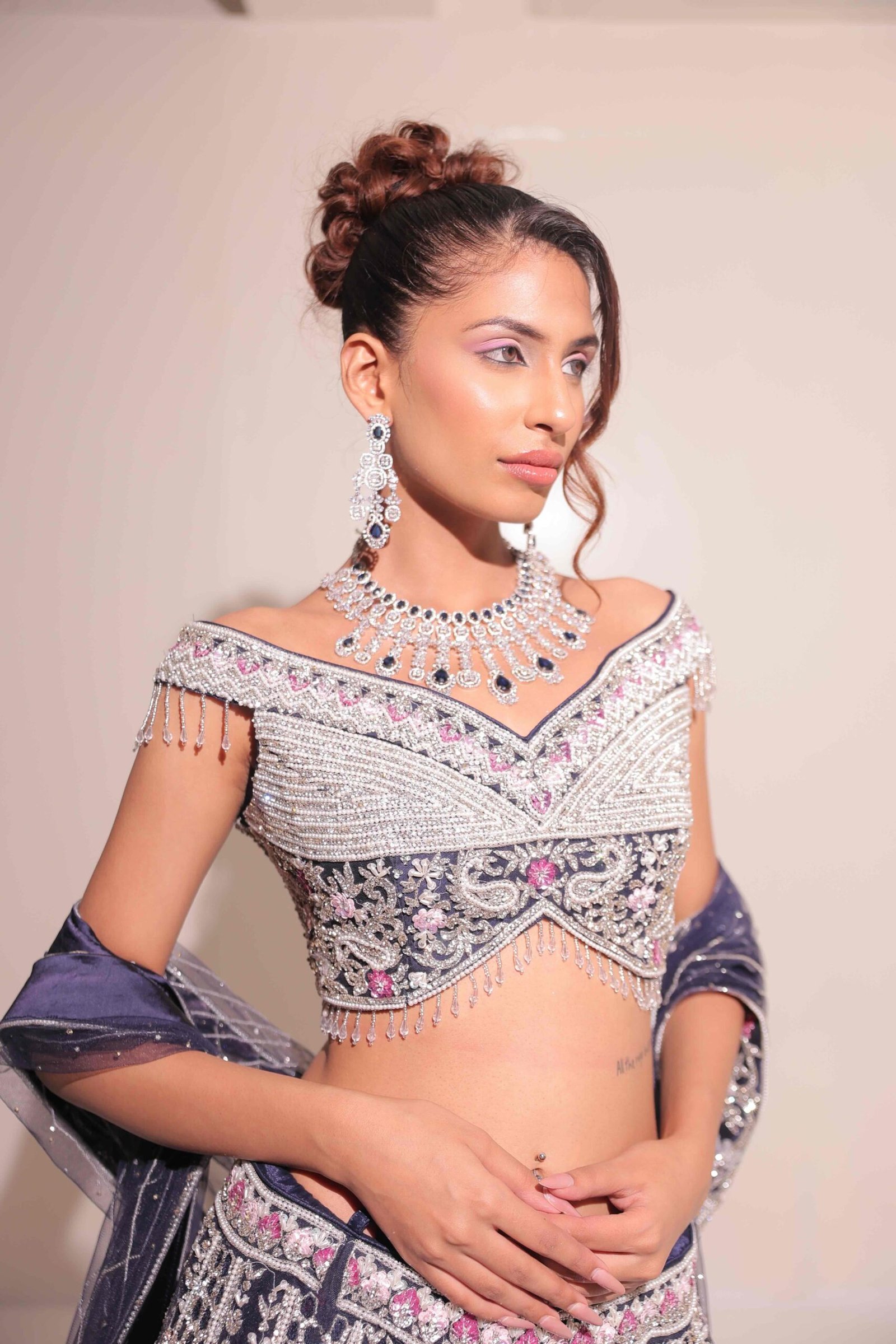 <p>Crafted in a deep midnight blue hue, the ensemble features intricate silver embroidery with hints of pink floral accents that add a touch of femininity.</p>