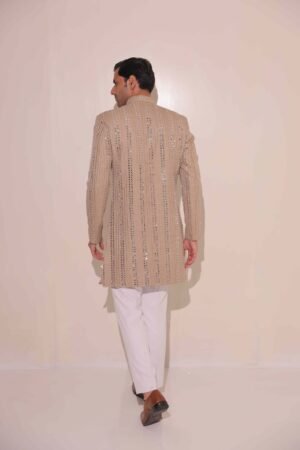 Designed in a subtle champagne beige tone, this sherwani features intricate mirror and thread embroidery that adds a modern shimmer to traditional elegance.