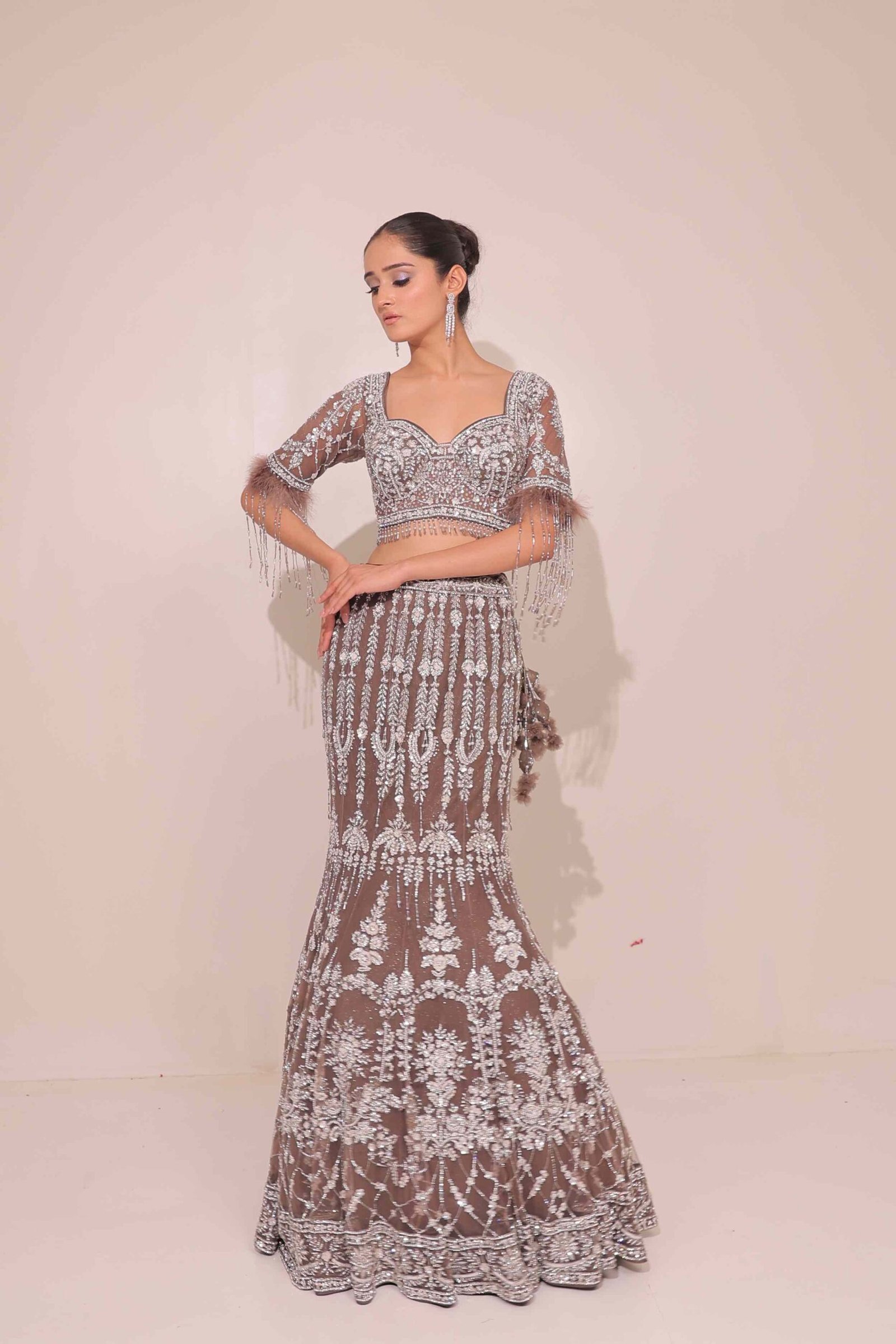 Be the first to review “Espresso Brown Fish-Cut Lehenga Set”