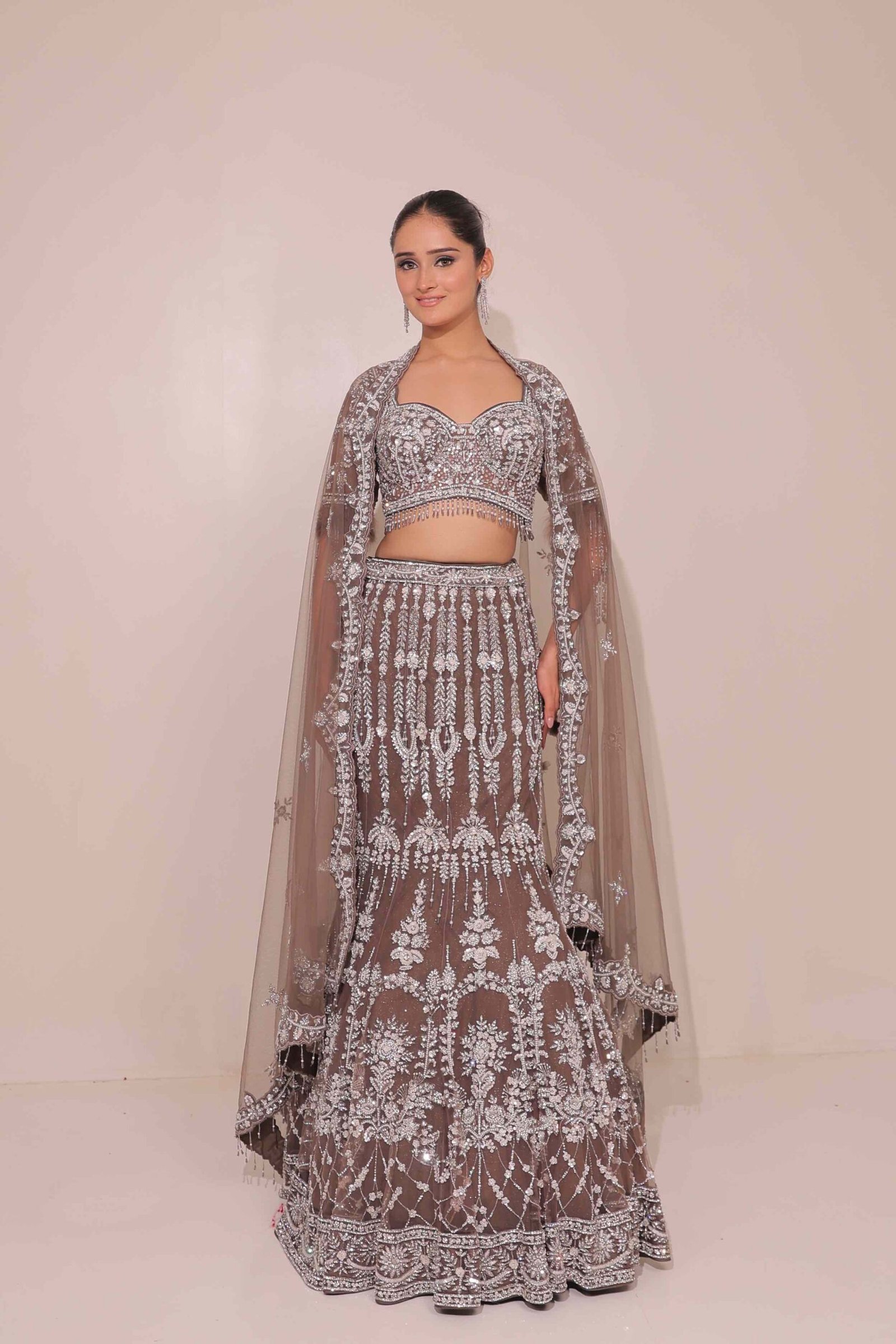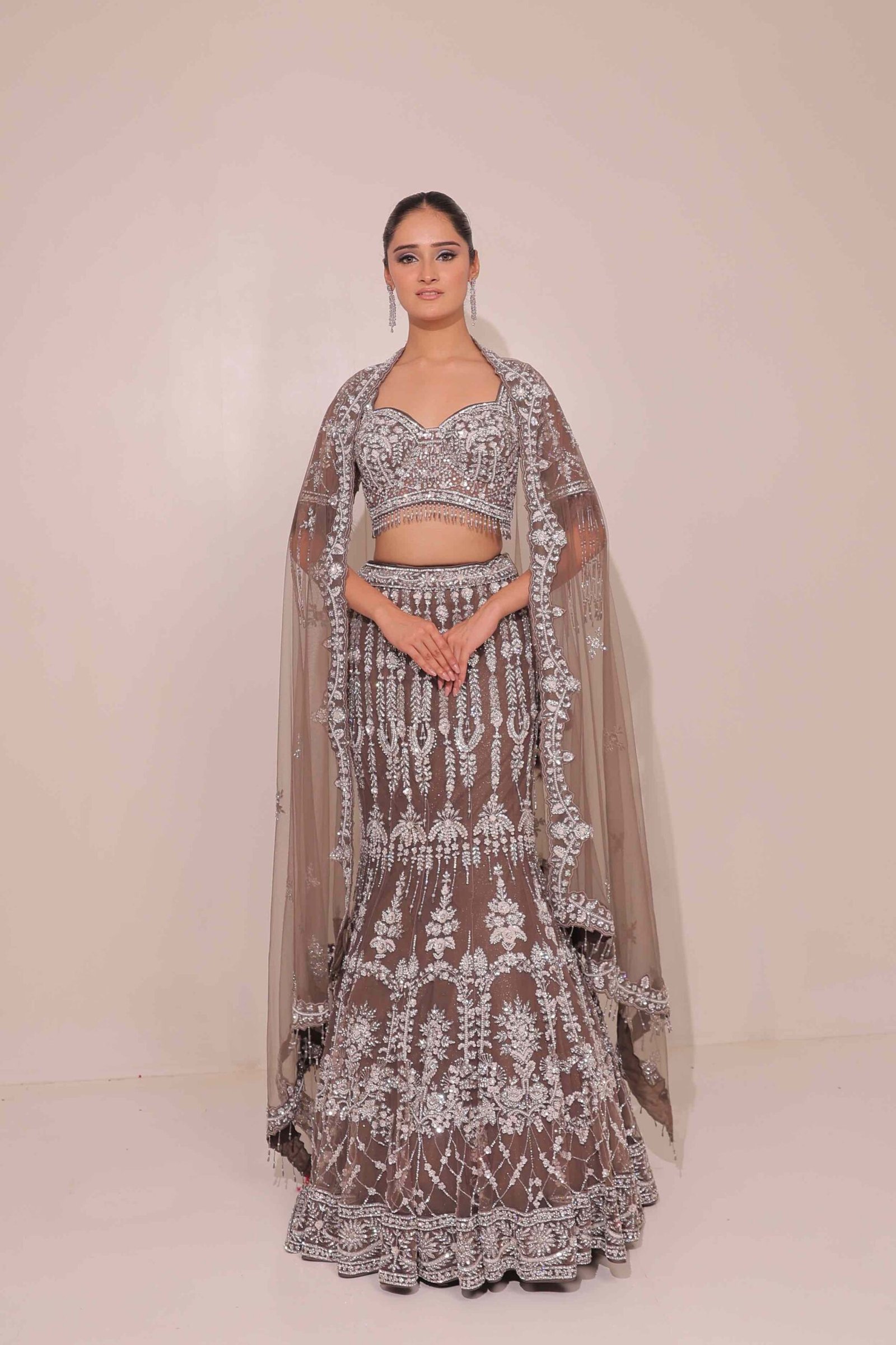 Earthy tones meet high-shine elegance in our Brown Fish-Cut Lehenga, designed for the modern muse who loves understated glamour.