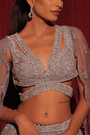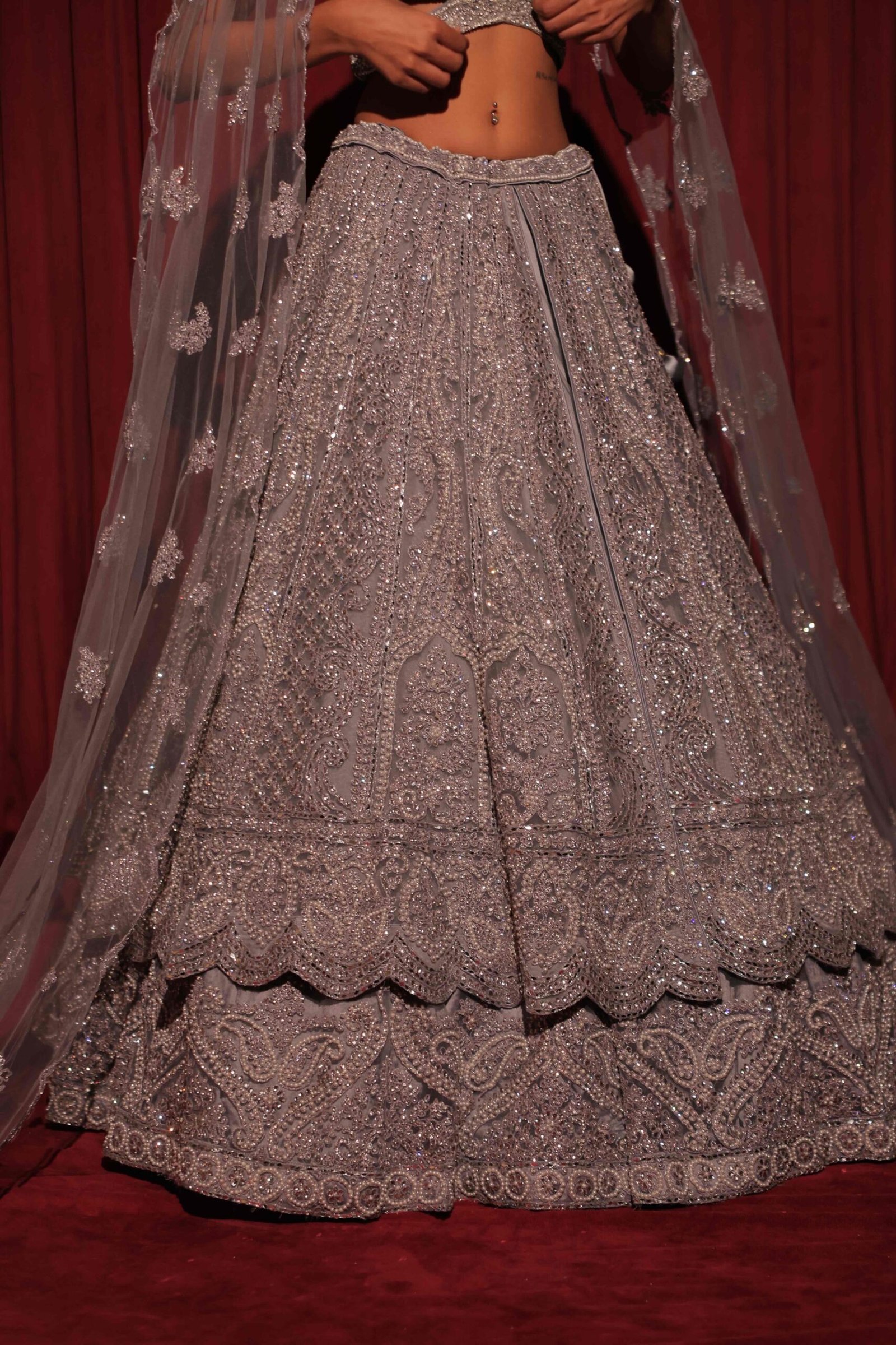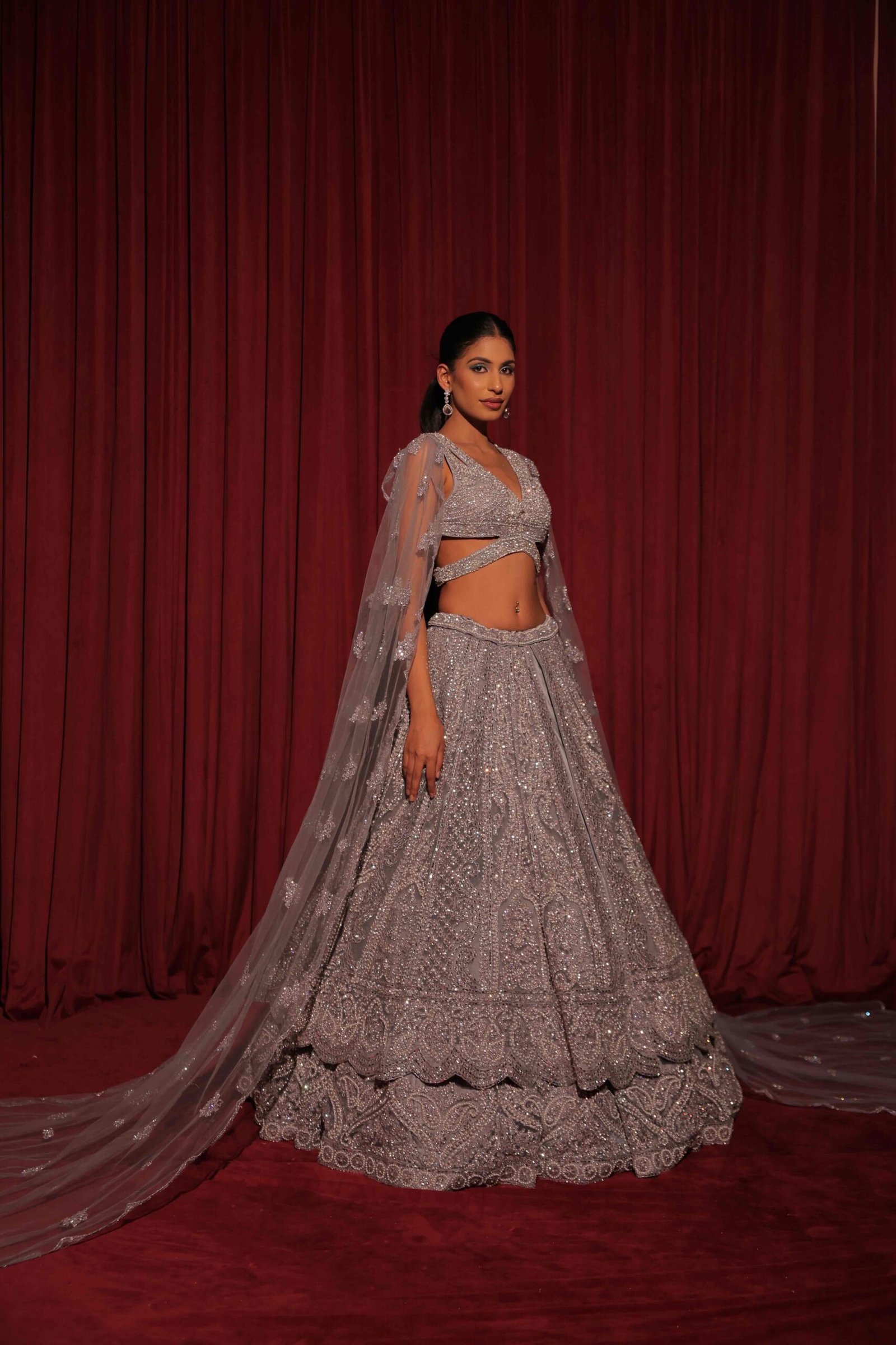 This stunning silver-grey lehenga radiates contemporary elegance and royal charm.