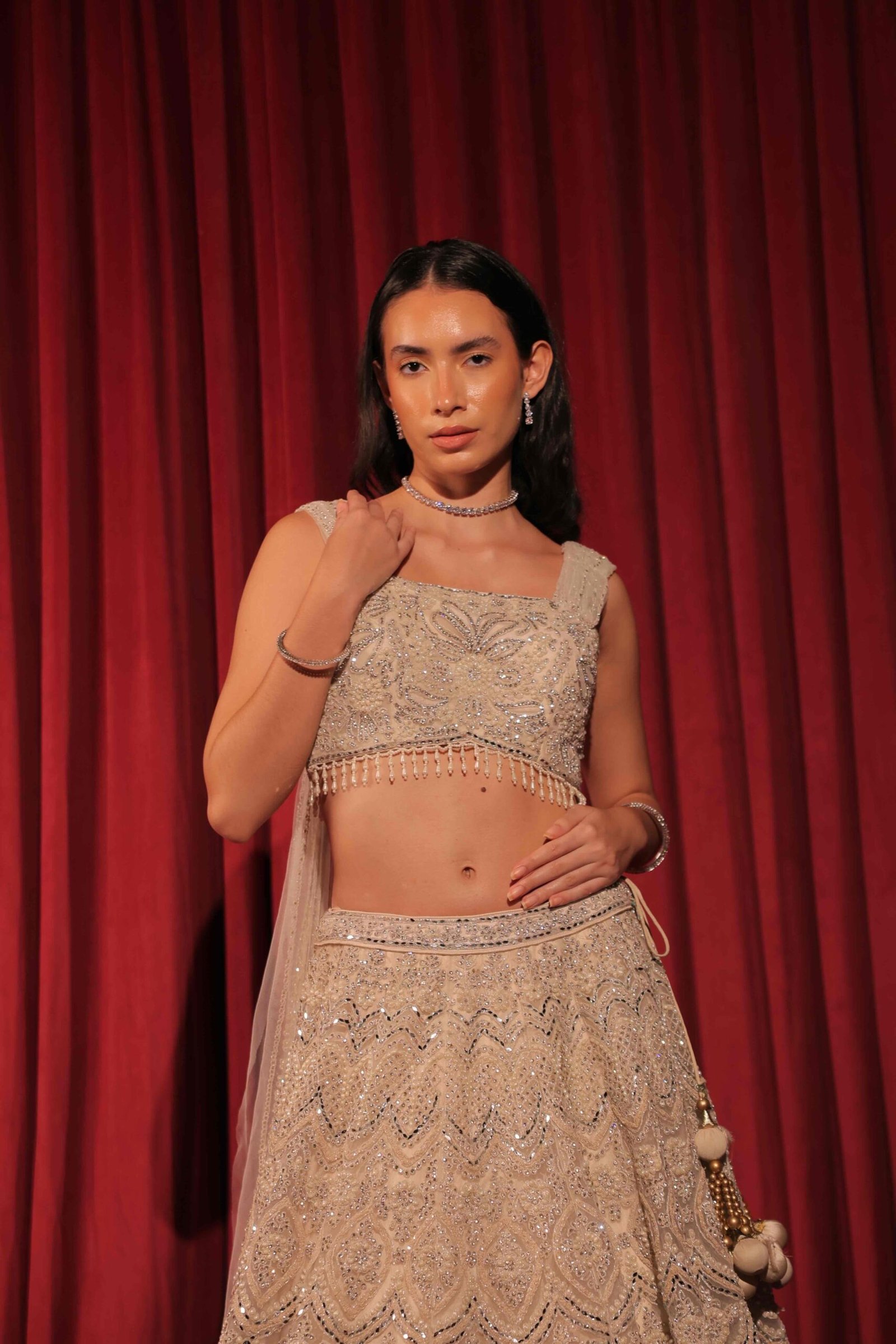 This lehenga beautifully balances traditional artistry with modern sophistication, offering a look that’s effortlessly elegant and captivating.