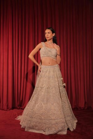 This exquisite beige-gold lehenga showcases timeless grace and intricate craftsmanship.