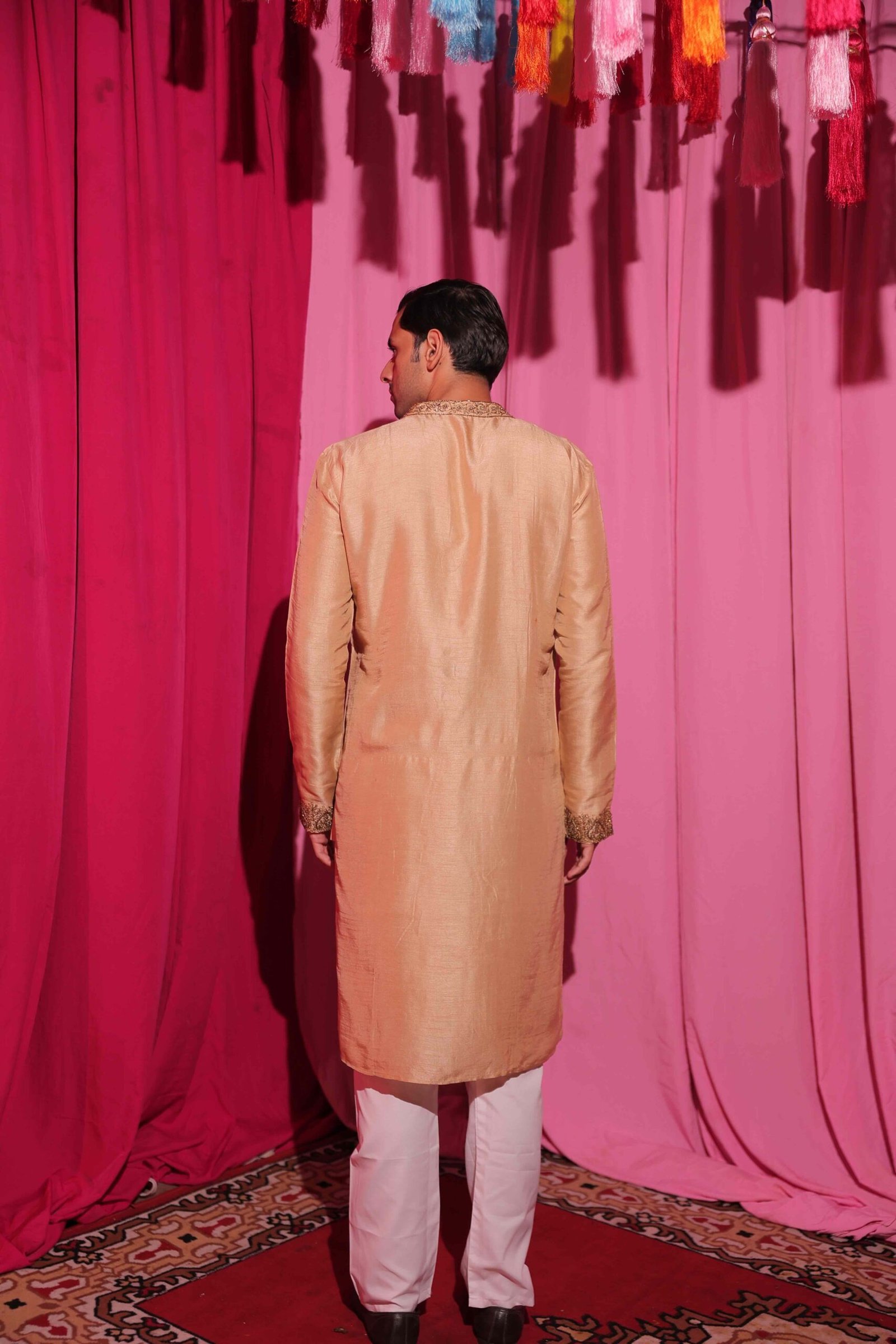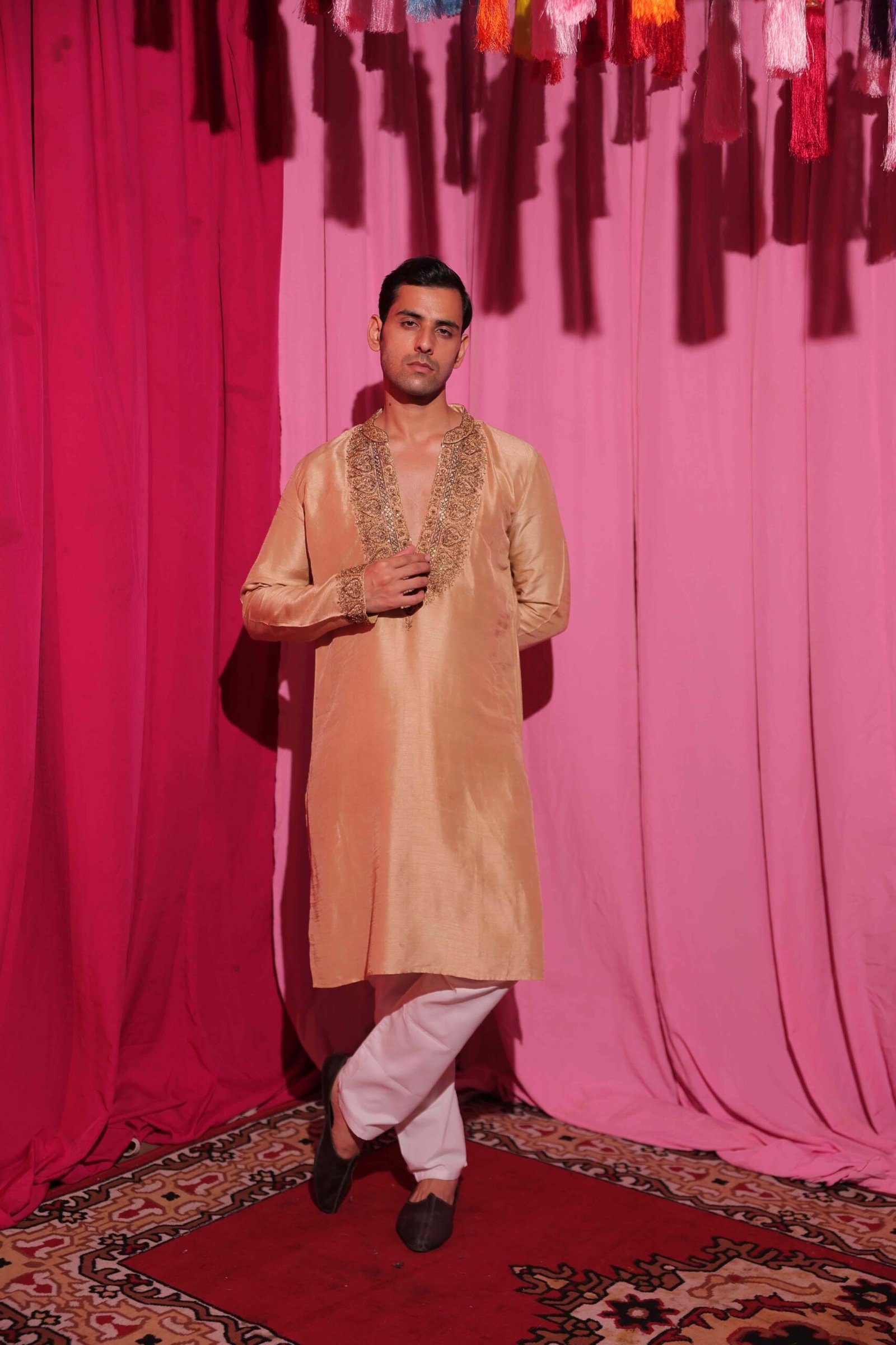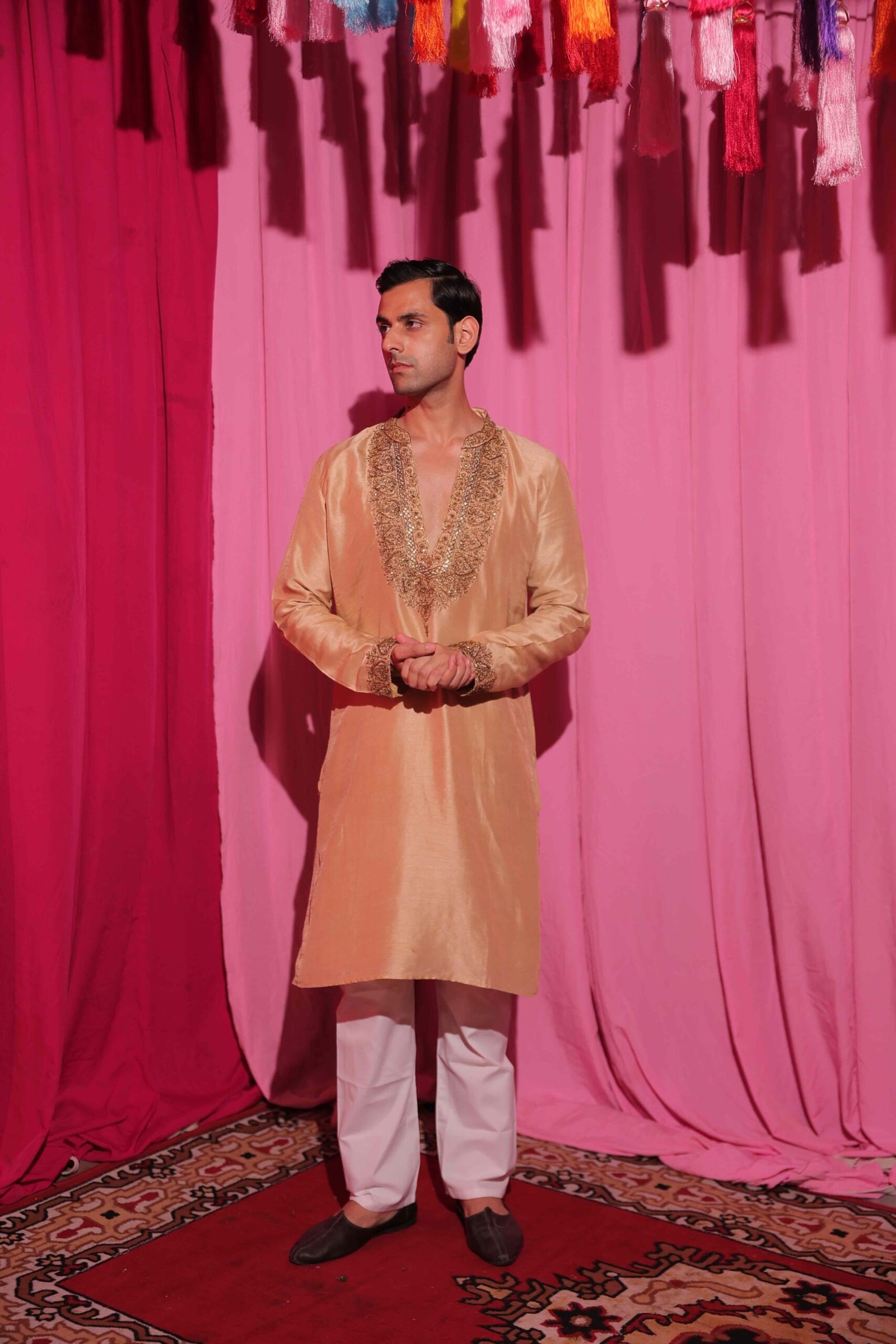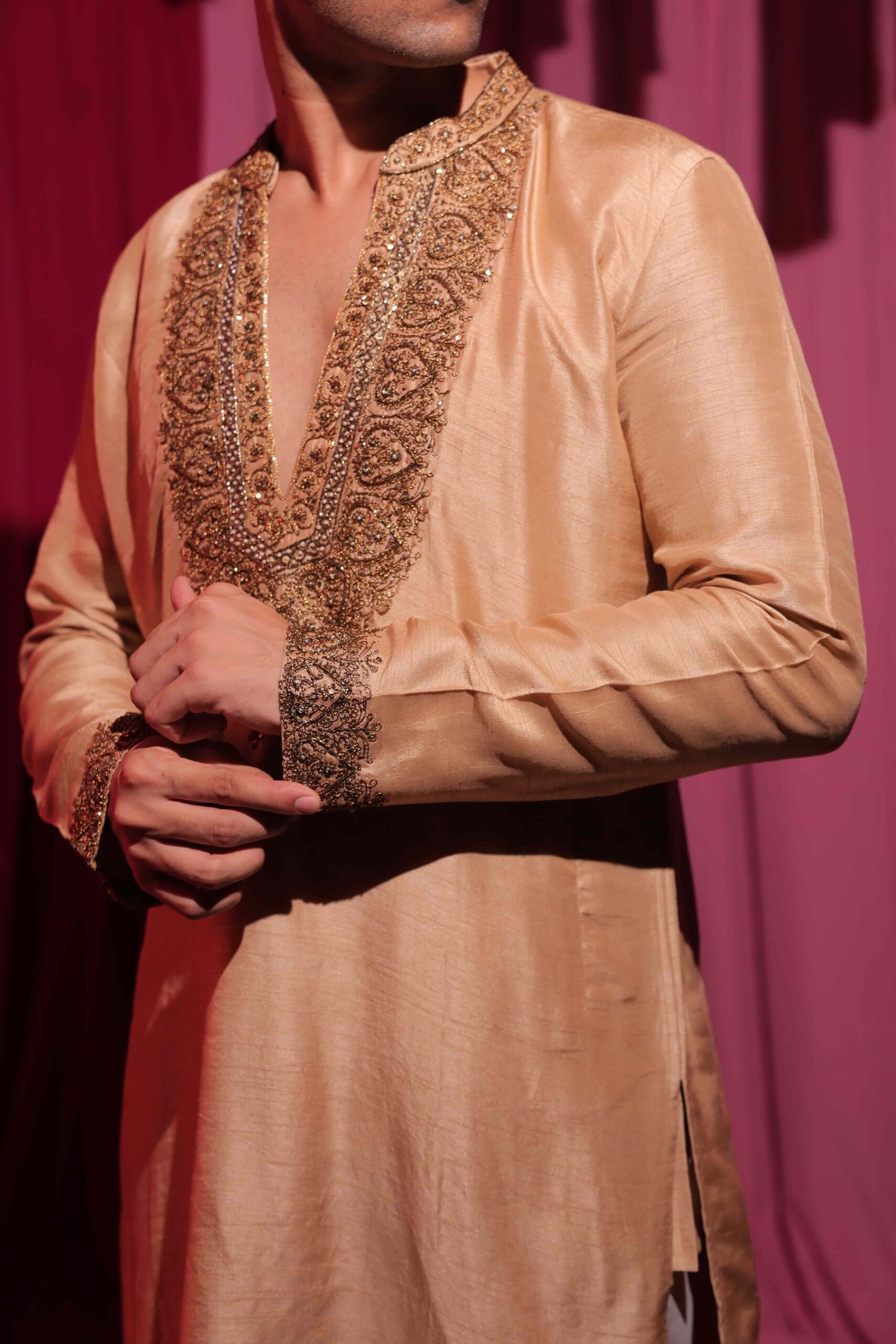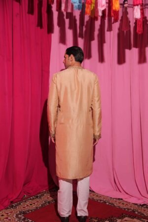 The champagne-gold silk kurta features a luxurious sheen, enhanced with intricate hand embroidery along the neckline for a refined, traditional charm.