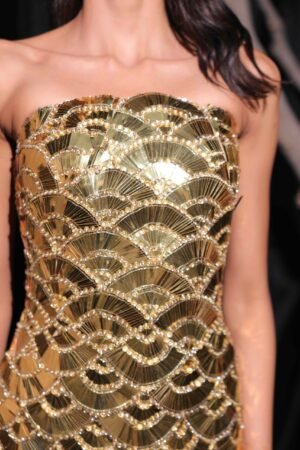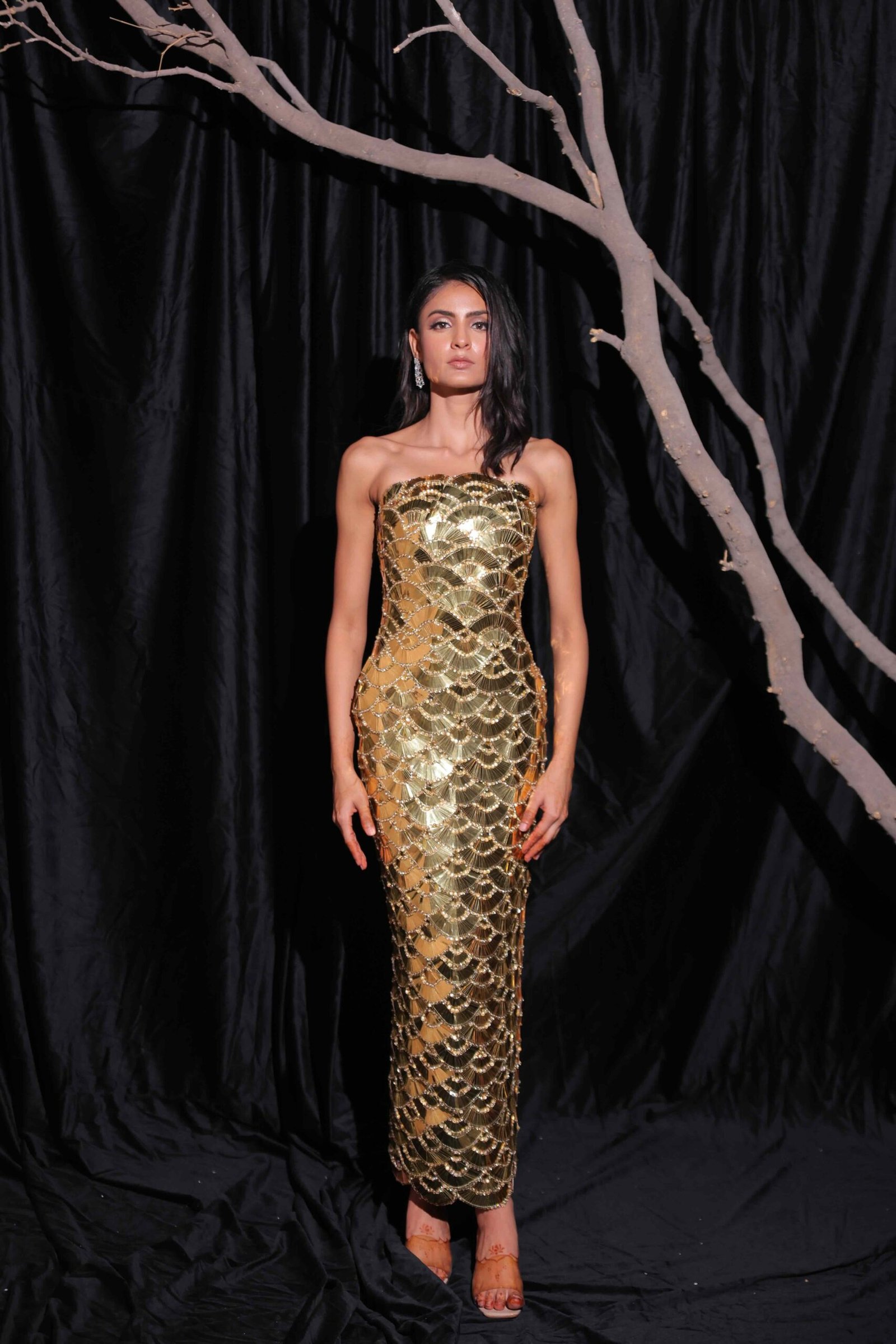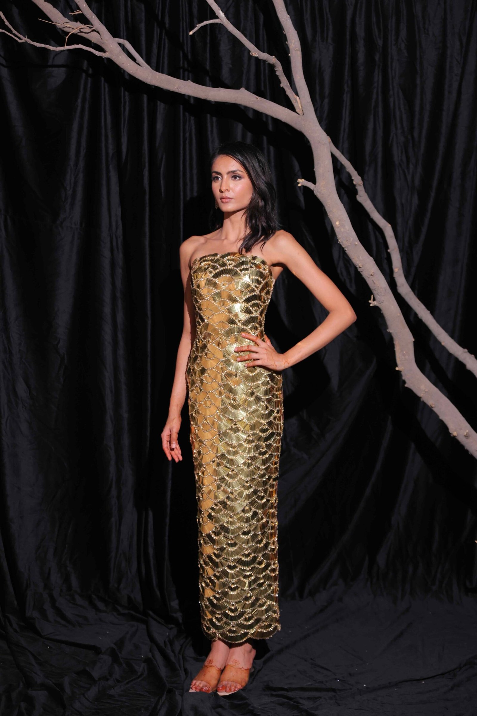Crafted in a sleek strapless silhouette, this body-hugging gown features intricate gold sequin and beadwork in scalloped patterns that create a mesmerizing reflective effect.