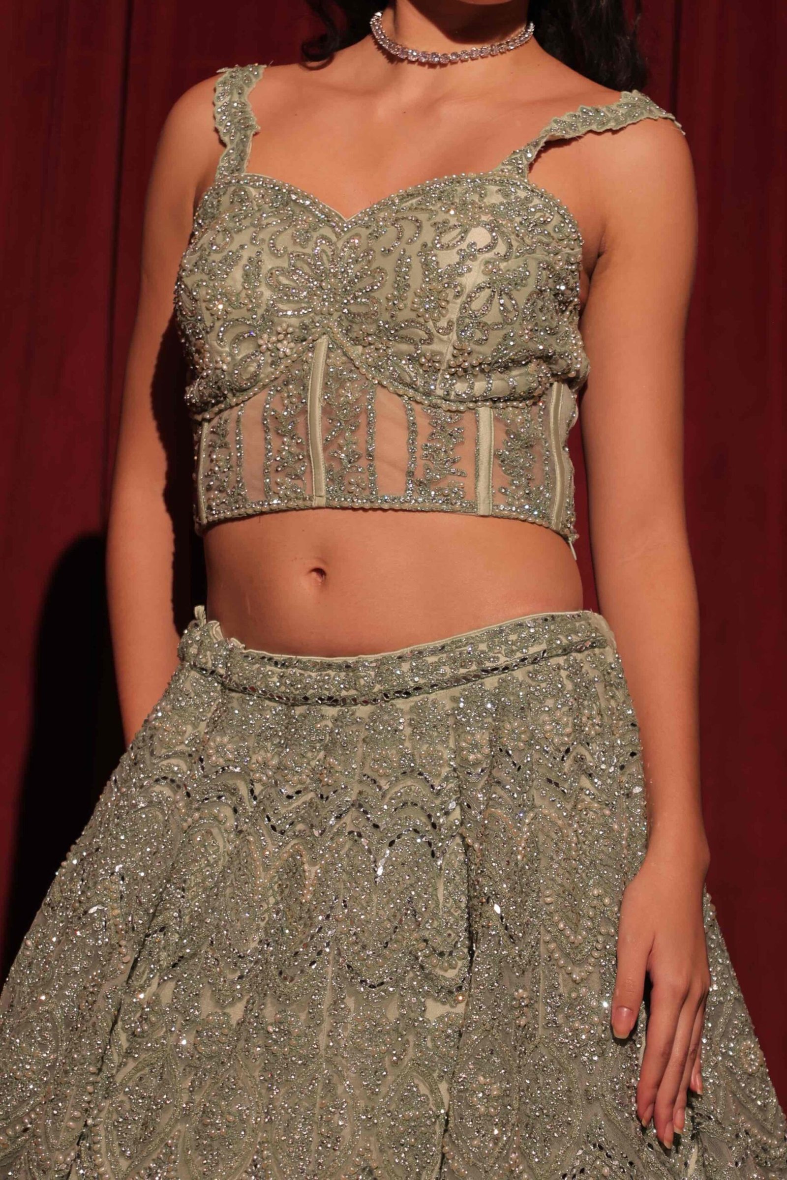 Radiating contemporary charm with a regal undertone, this sage green lehenga is a masterpiece of intricate craftsmanship.