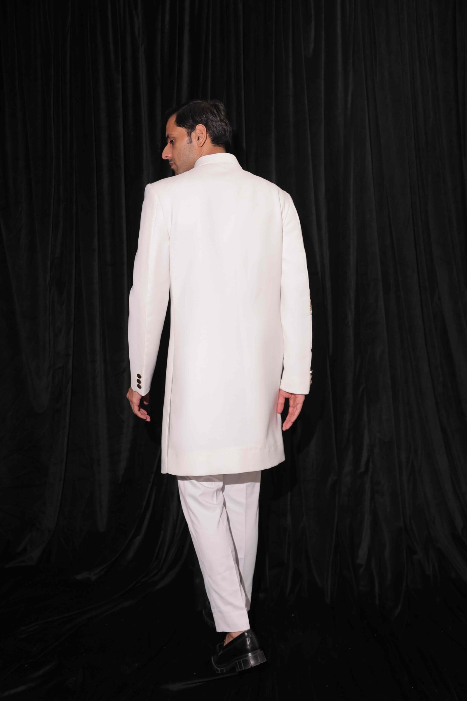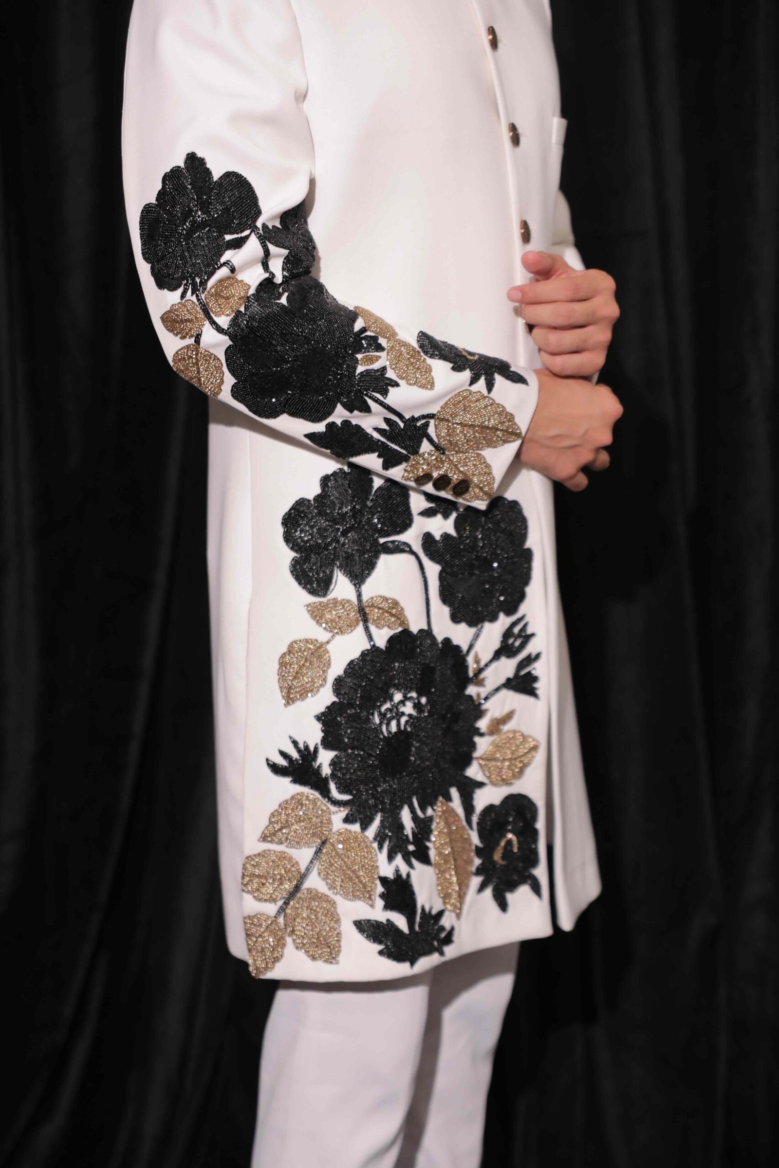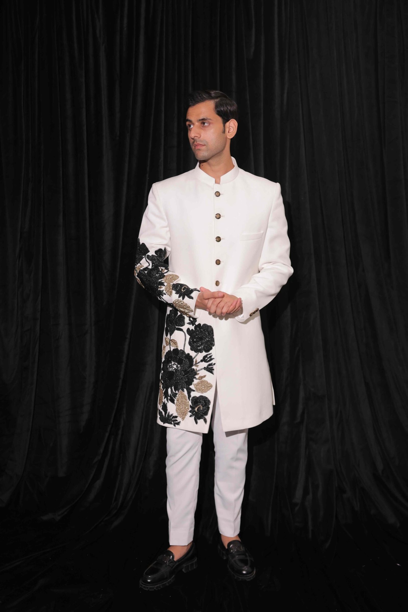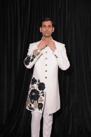 Make a refined statement in our Ivory Noir Embroidered Sherwani, a blend of timeless sophistication and contemporary charm.