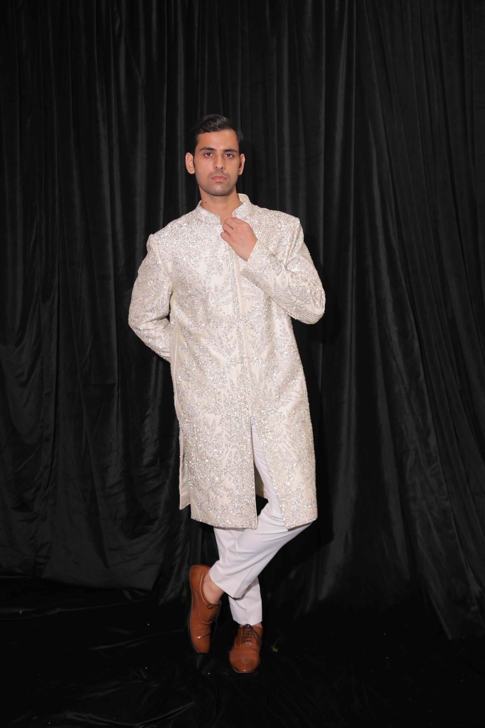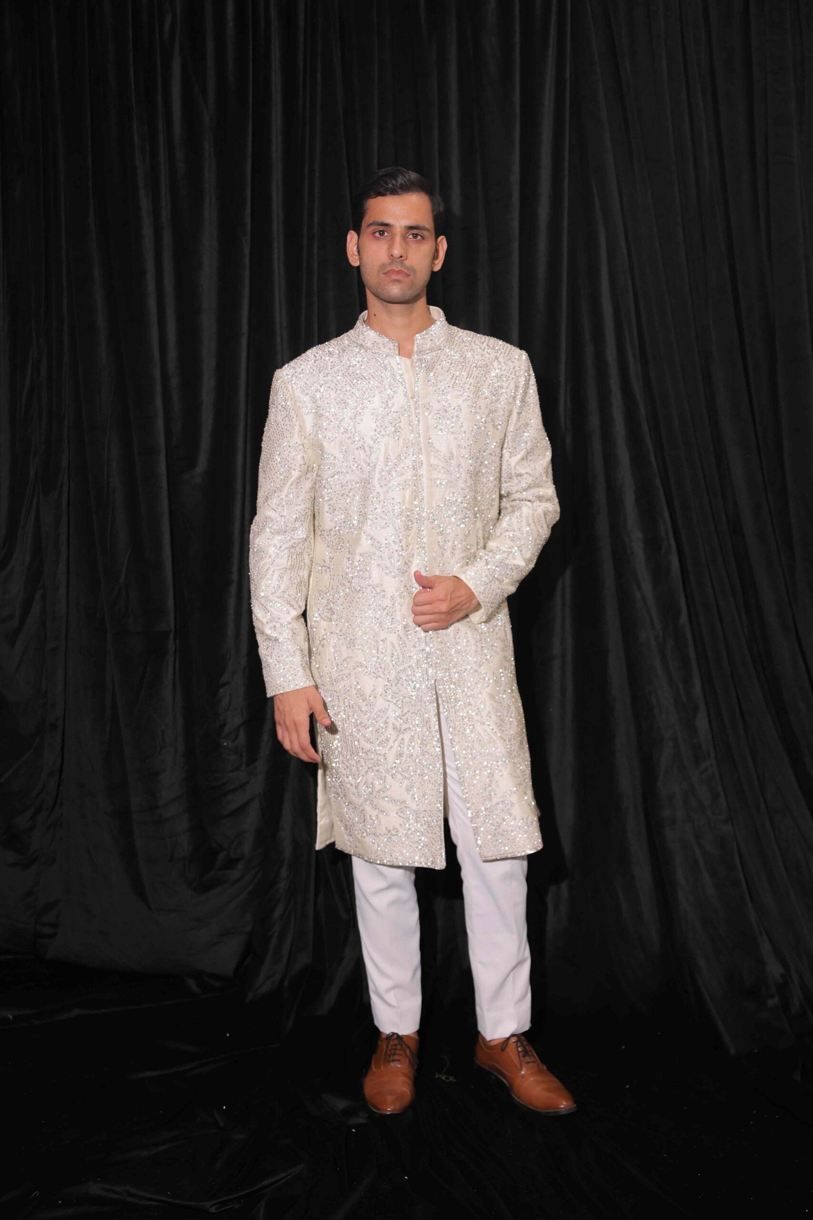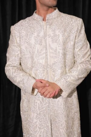Exude royal sophistication with our Ivory Radiance Sherwani, meticulously adorned with intricate hand embroidery and crystal embellishments.