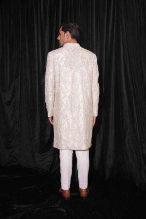 Crafted in a luxurious ivory white base, this sherwani is designed for the modern groom who values timeless style.