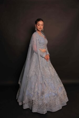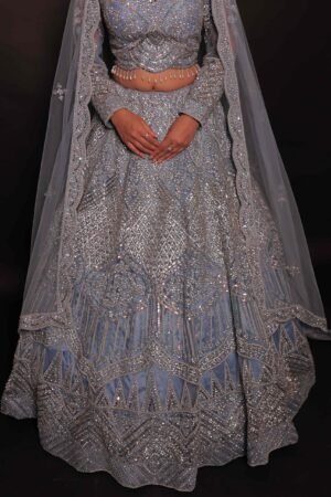 Crafted from lightweight tulle fabric, this ethereal lehenga is adorned with shimmering sequins, radiant rhinestones, reflective mirror work, and delicate resham embroidery, all layered beautifully over a soothing light blue base.