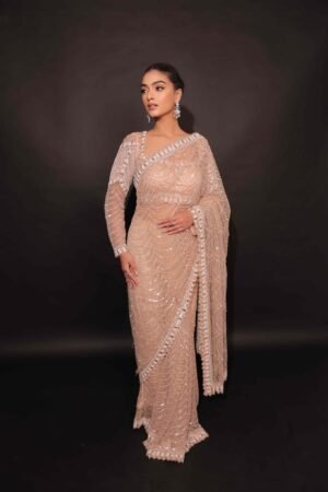 Crafted from delicate tulle fabric, this saree features intricate sequin detailing and glistening rhinestones that shimmer softly with every movement.