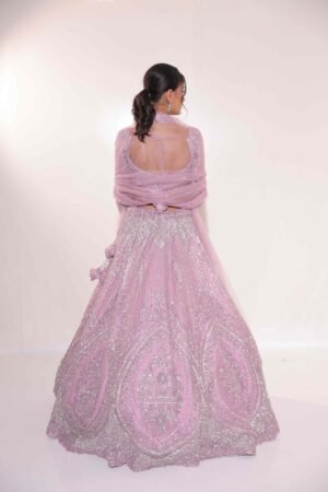 Crafted in a soft lilac hue, this ethereal ensemble features intricate sequin and bead embellishments that glisten with every movement.