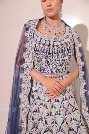 Crafted in a rich navy blue base, the ensemble features intricate silver embroidery and sequin detailing that glisten with every movement.