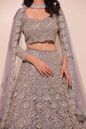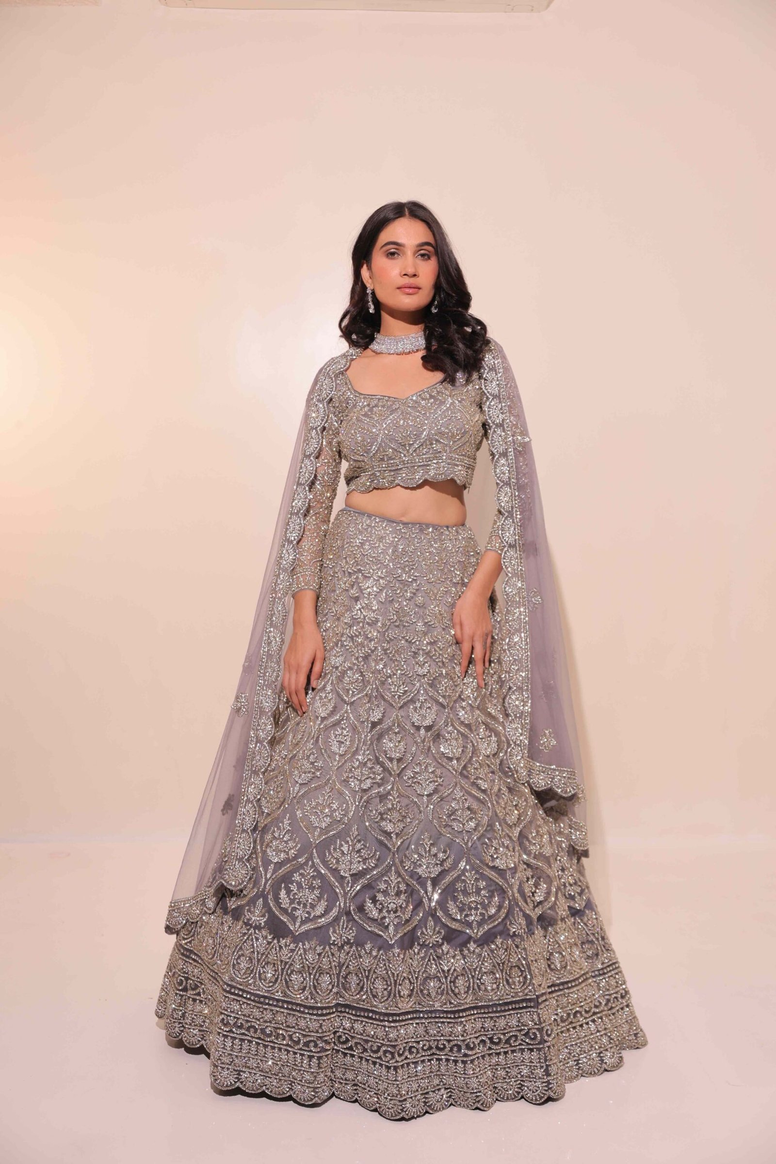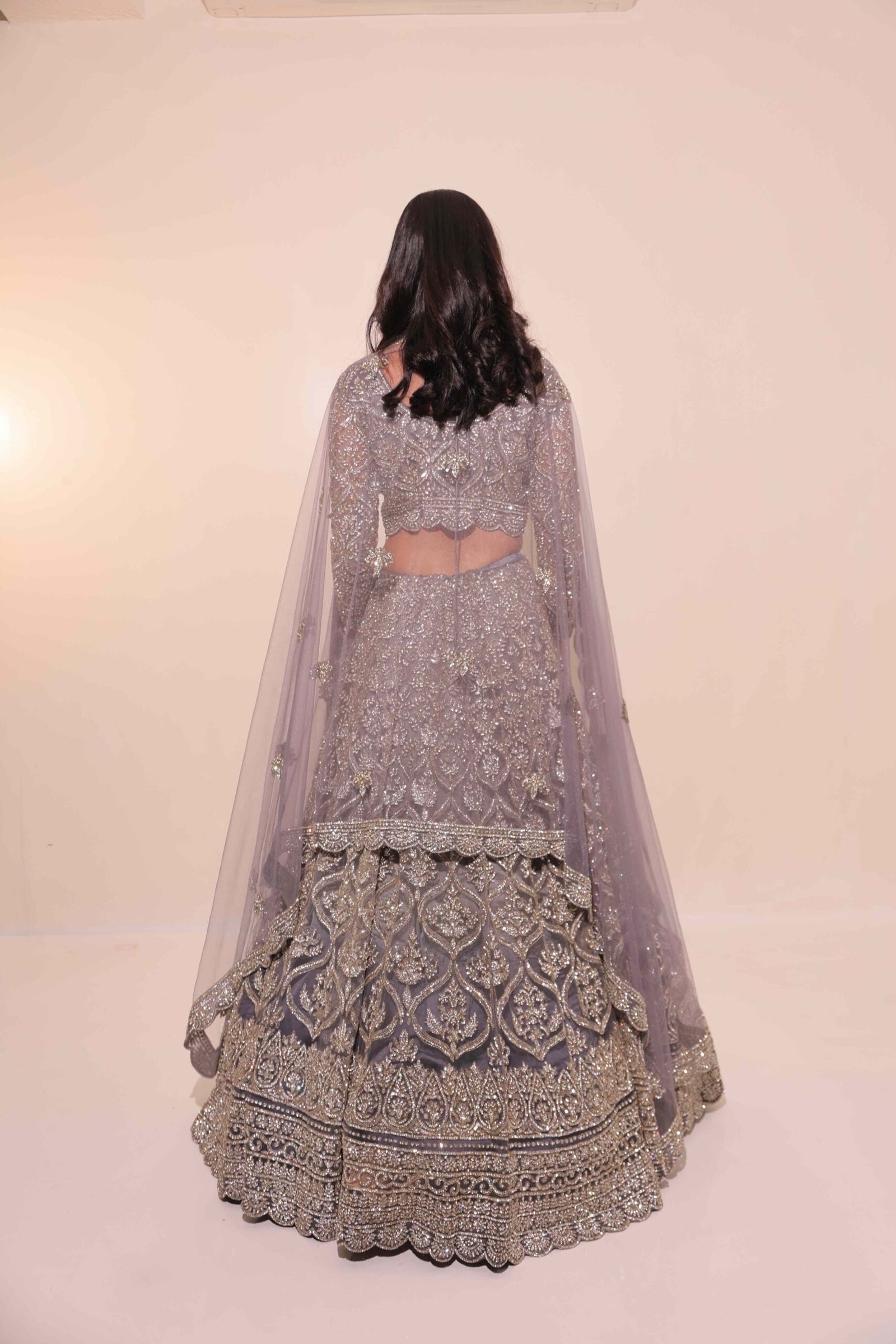 The Moonlit Mirage Lehenga radiates understated grandeur in a serene smokey lilac-grey hue.