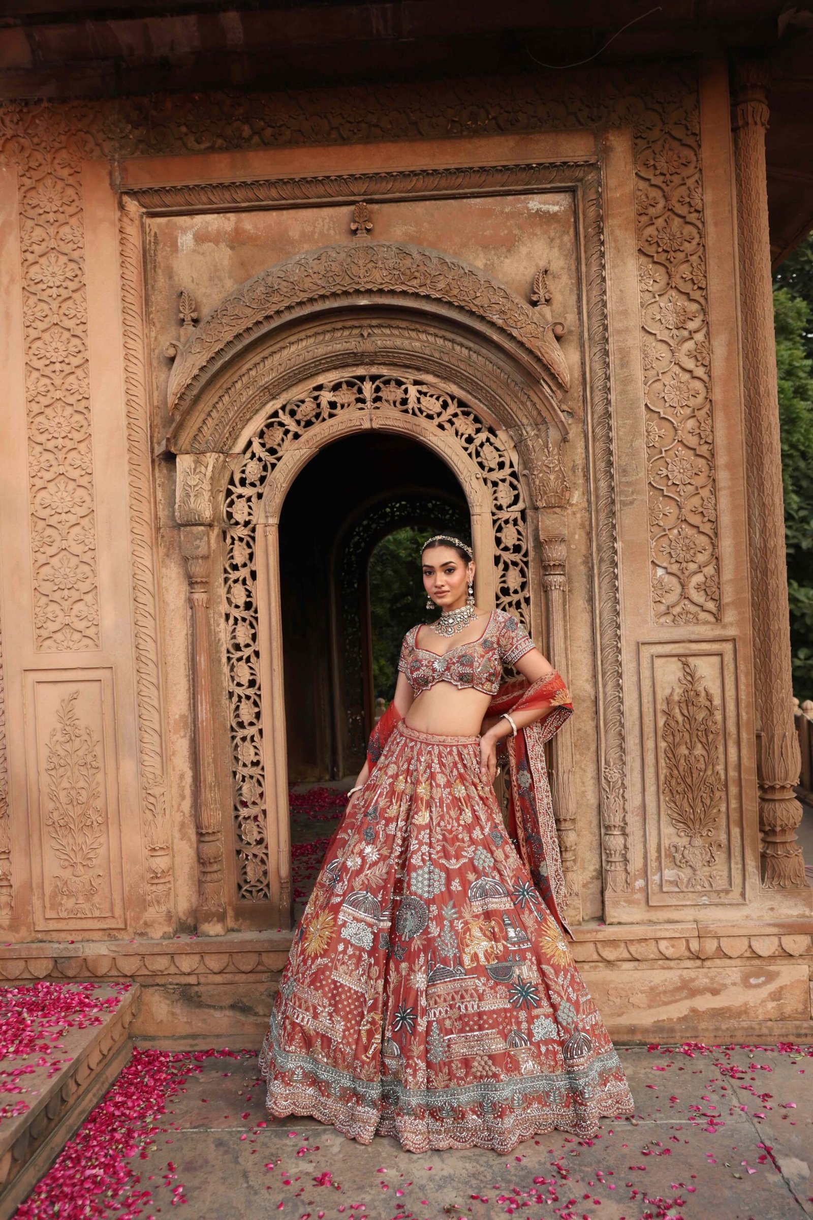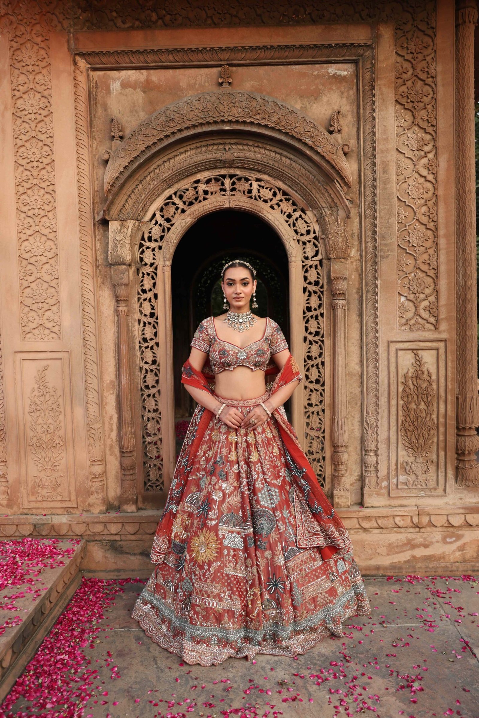 The burnt sienna base is adorned with elaborate resham, zari, and mirror embroidery that narrates tales of royal architecture and Mughal gardens through its intricate motifs.