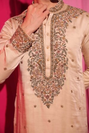 Tailored in a soft champagne beige hue, this kurta features intricate thread and sequin embroidery along the neckline and chest, creating a regal statement.