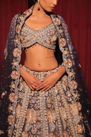 Step into regal splendour with this breathtaking midnight blue and gold lehenga set.