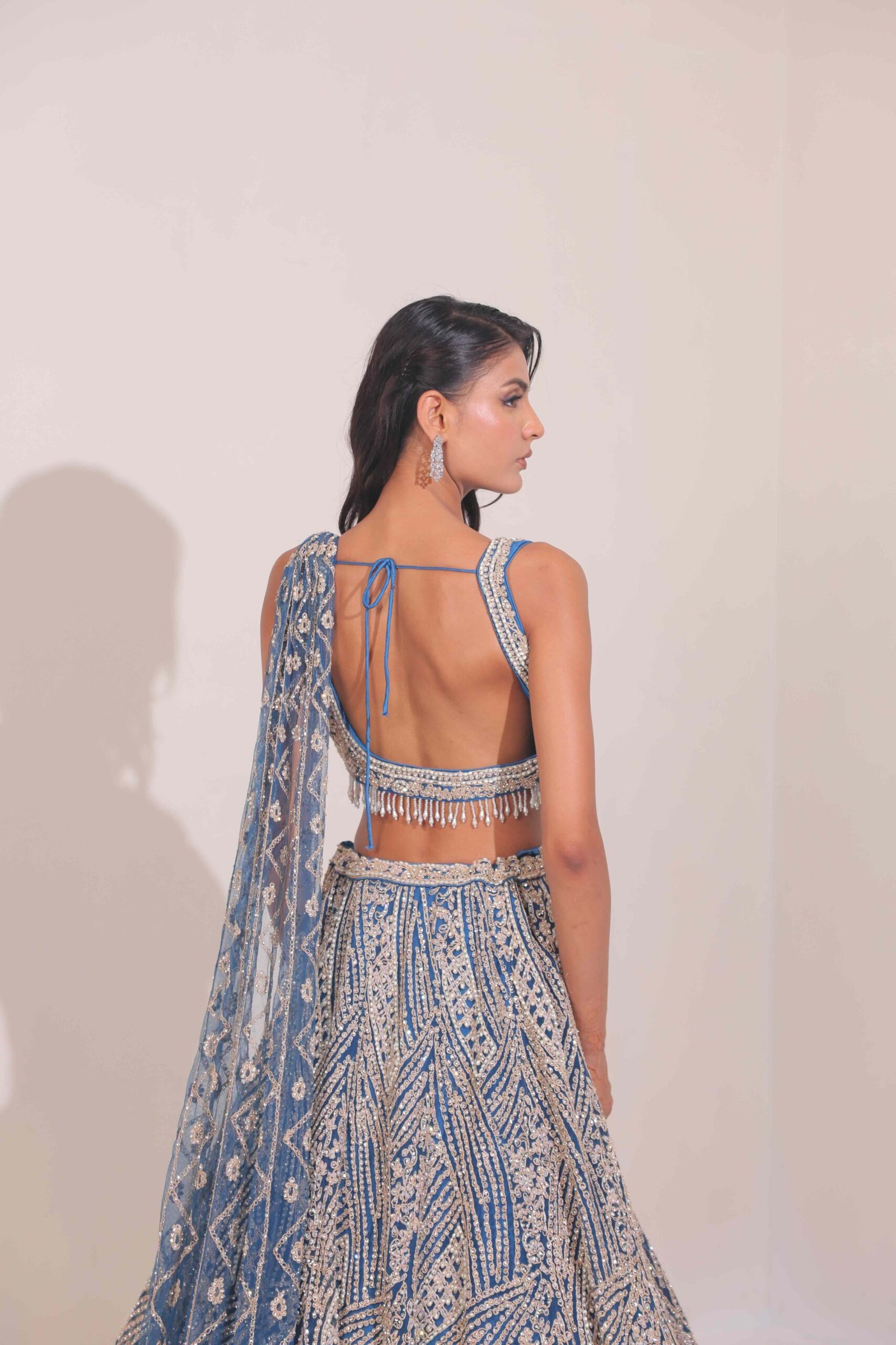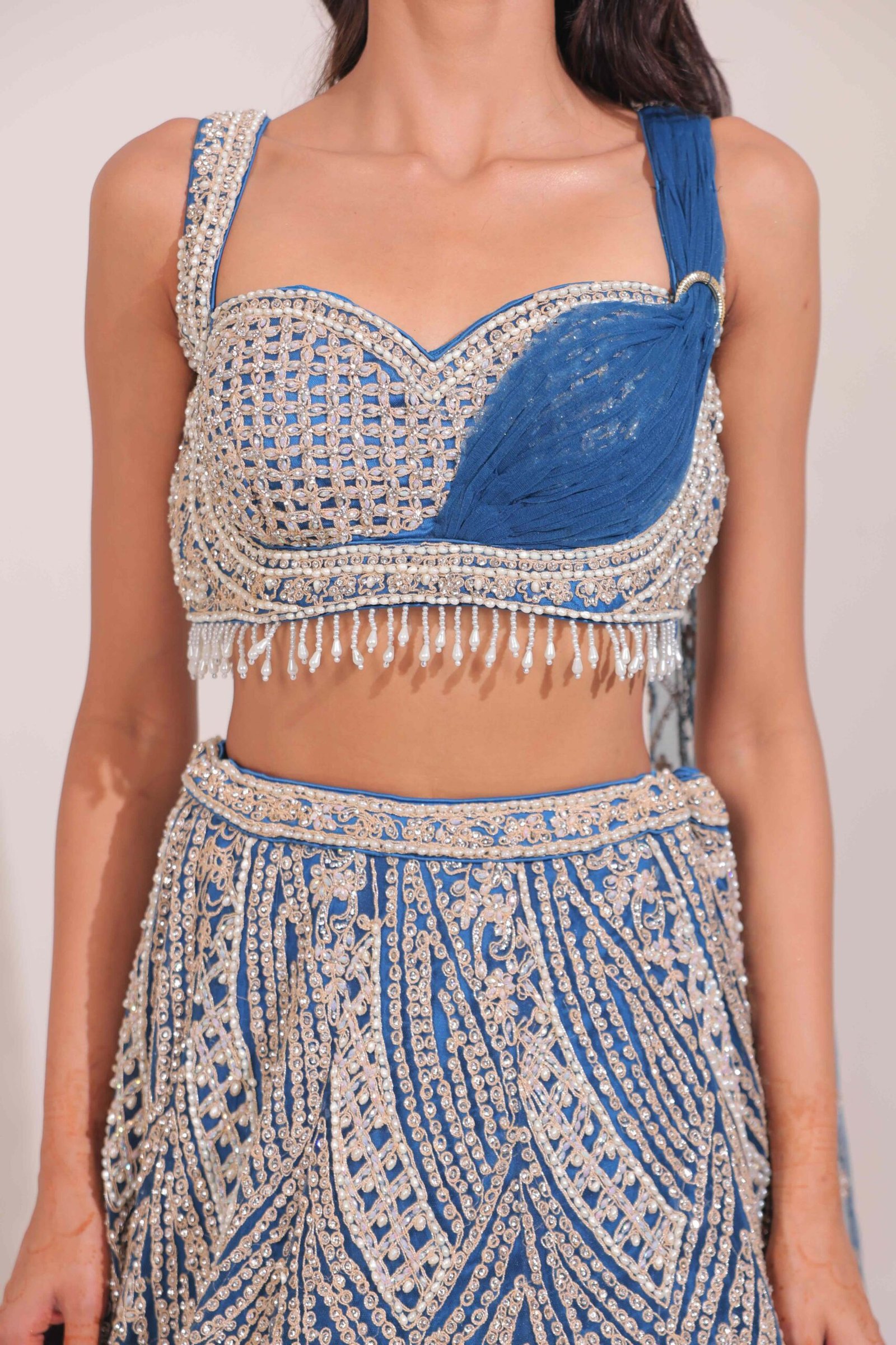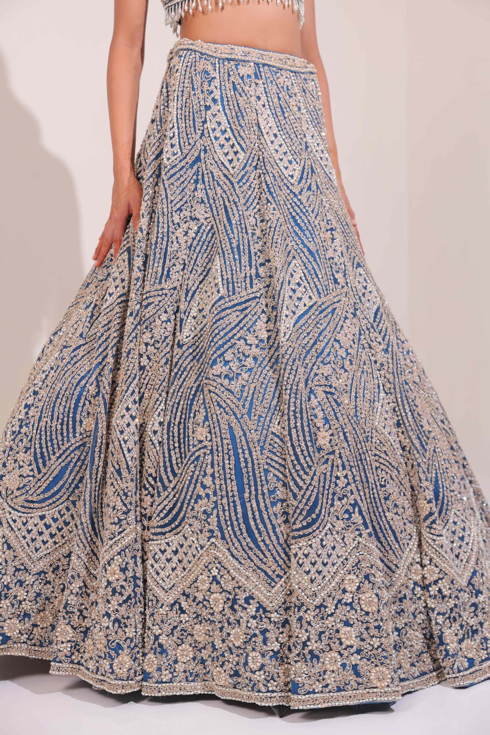 The lehenga features intricate sequin, zardozi, and thread embroidery that flows in elegant wave-like patterns, capturing the beauty of oceanic shimmer.