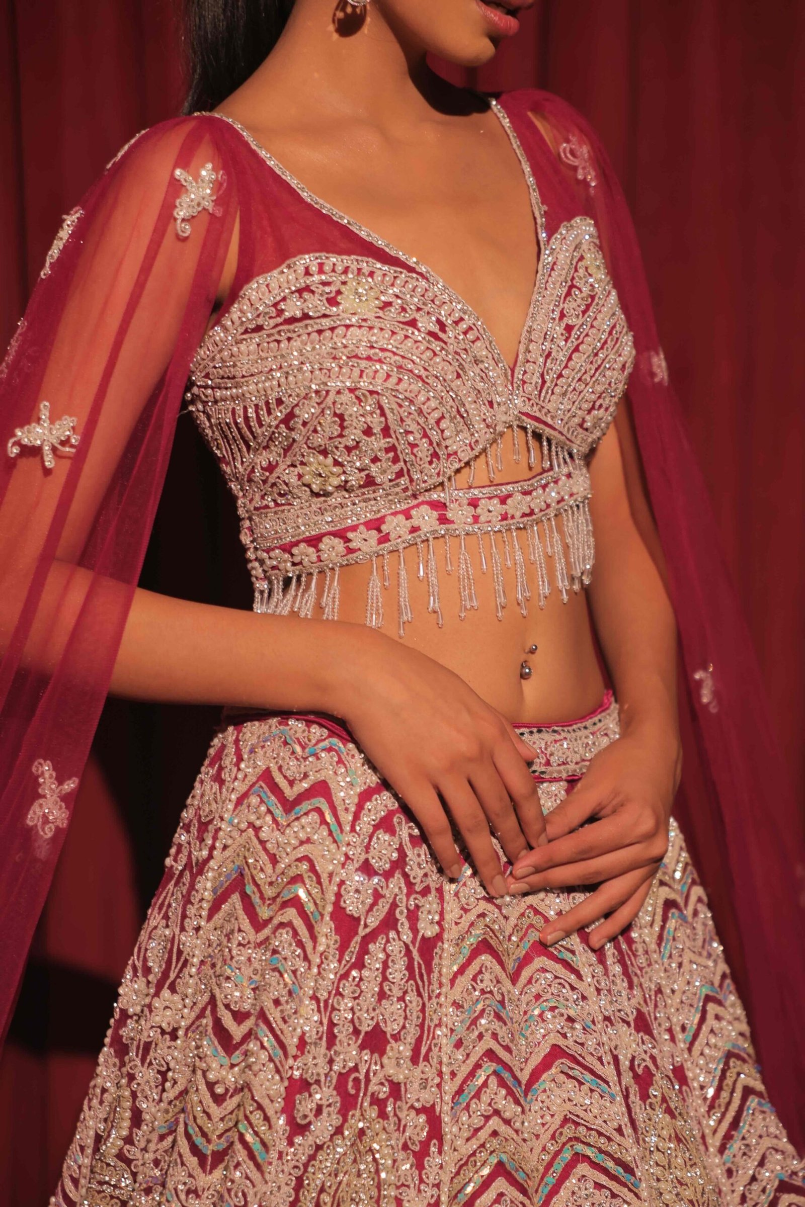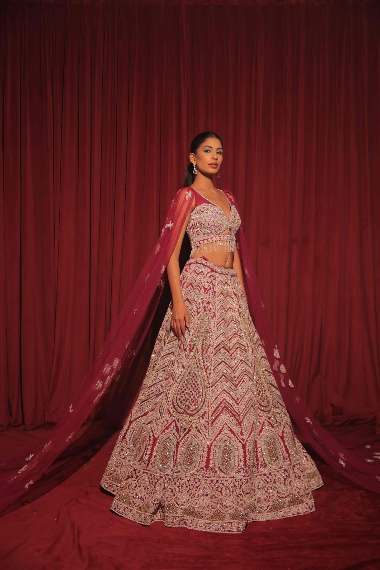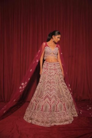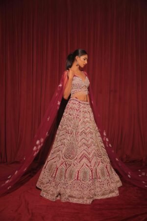 Turn heads in this enchanting wine pink lehenga set, radiating regal charm and contemporary elegance.