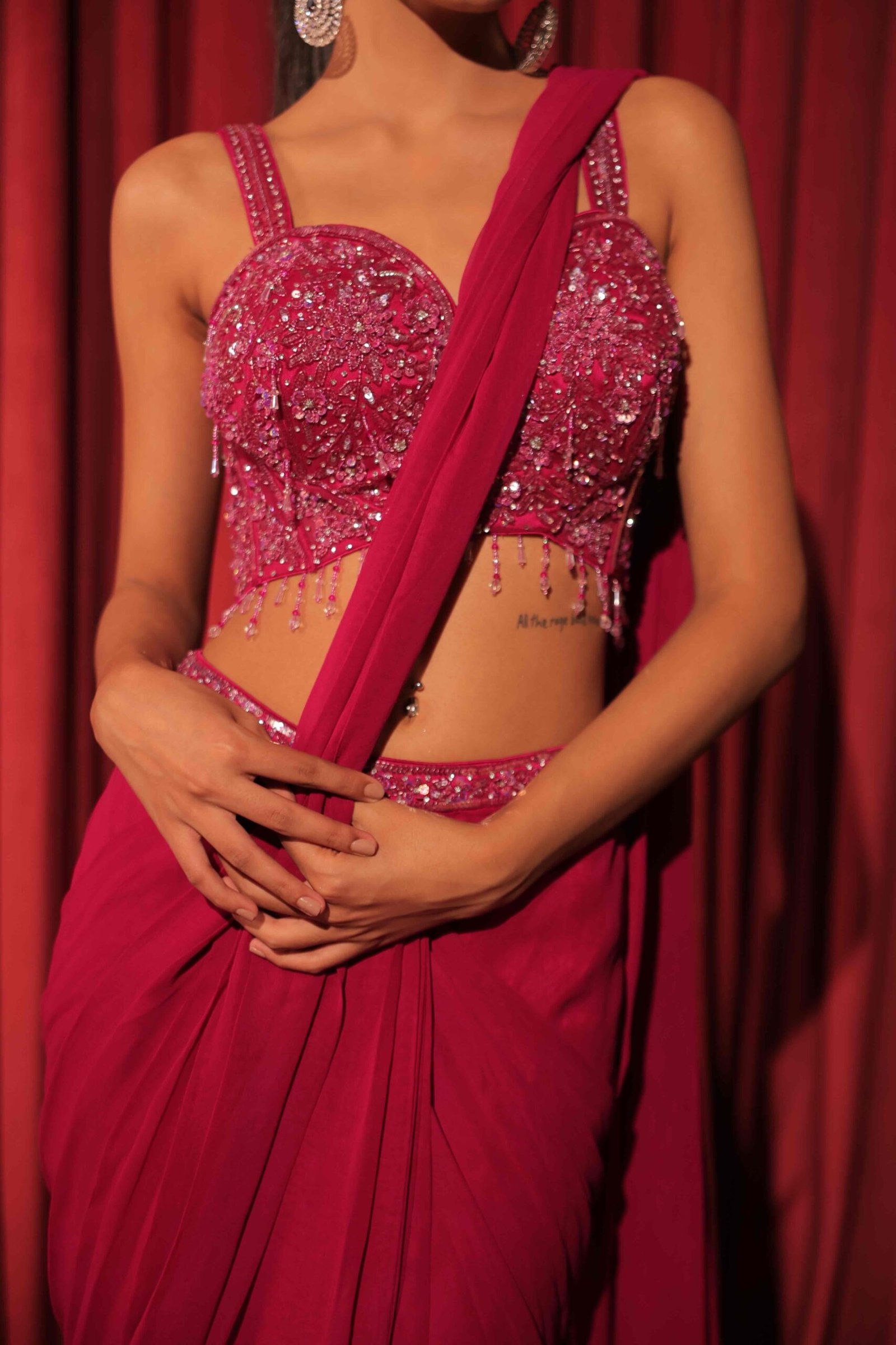 The intricately hand-embellished blouse, adorned with sequins and beadwork, adds a luxurious touch that perfectly complements the rich hue.
