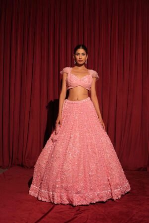Radiate charm and grace in this dreamy blush pink lehenga set, delicately embellished with sequins, beads, and floral handwork.
