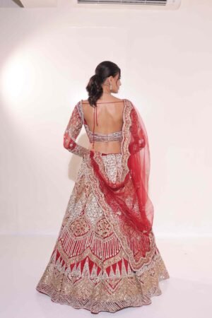 Drenched in a rich red hue, the lehenga features intricate zardozi, sequin, and stone hand embroidery that reflects regal craftsmanship.