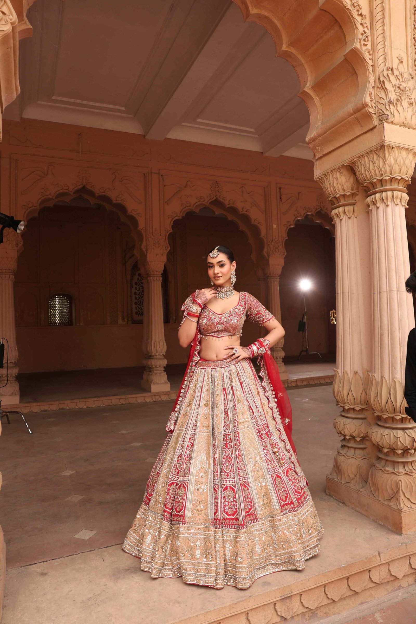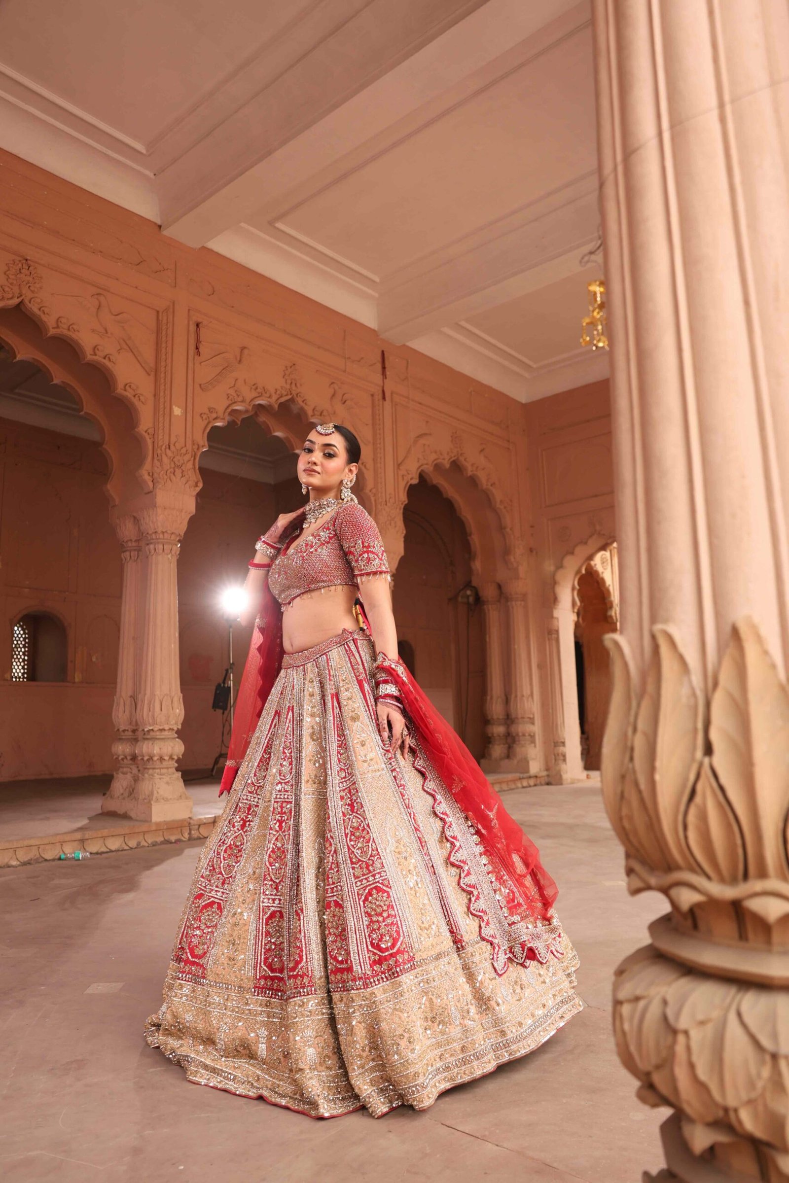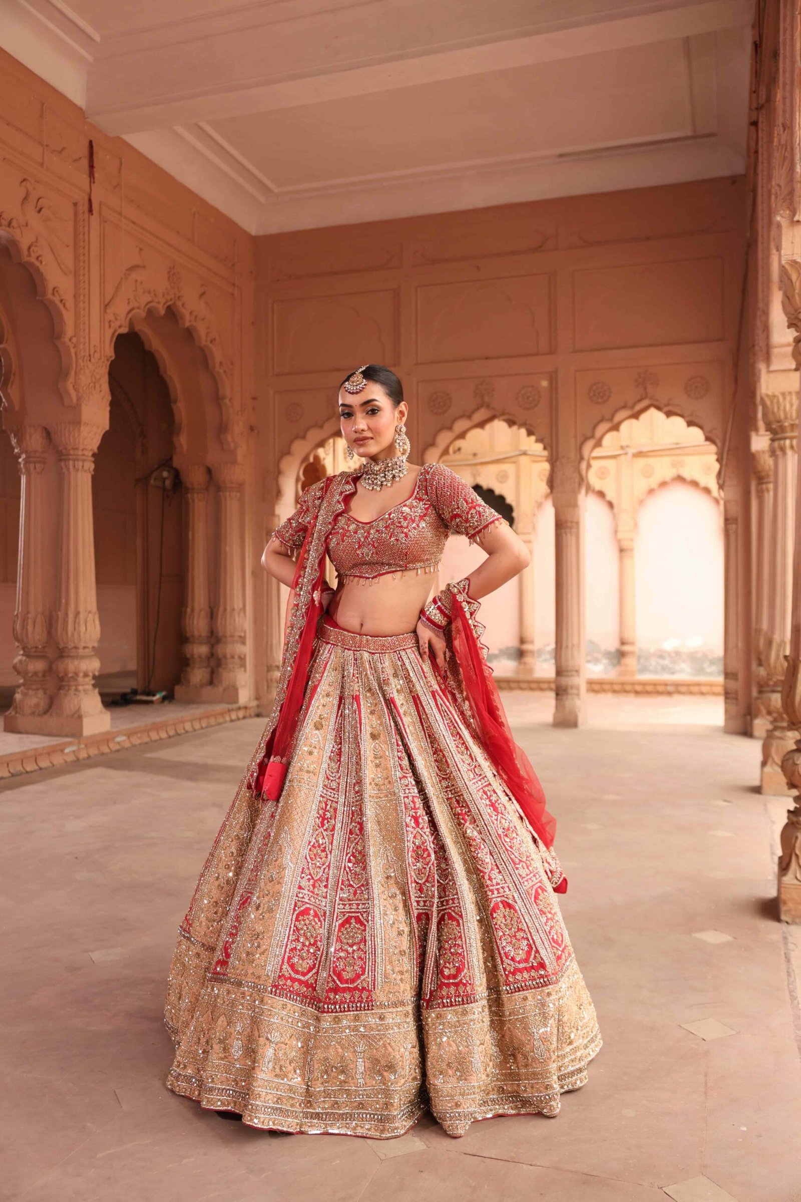 The lehenga features intricate zardozi, dabka, and sequin embroidery in gold, beautifully contrasted against a scarlet red base.