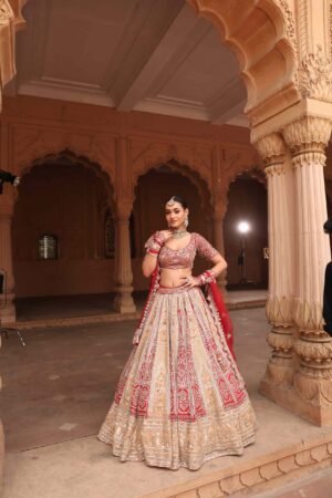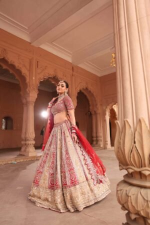 Finished with a sheer red dupatta featuring ornate borders, this ensemble embodies grandeur, grace, and everlasting bridal allure — perfect for the wedding day’s most unforgettable moments.